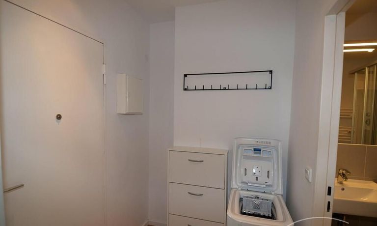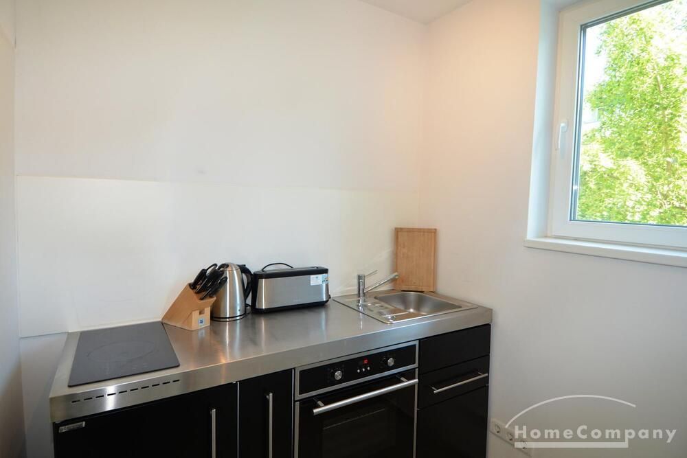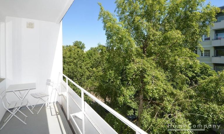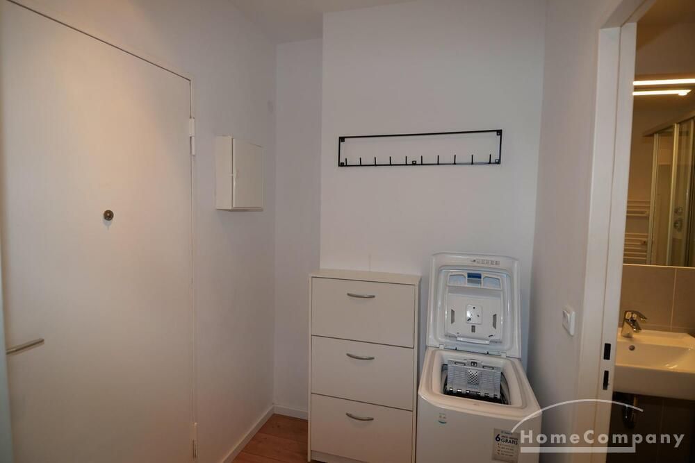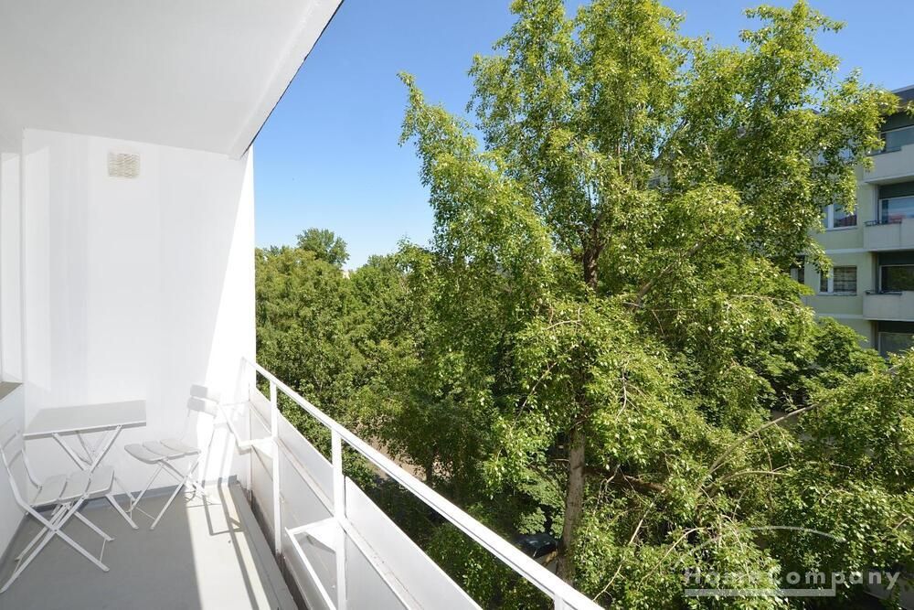 First occupancy! One room apartment in Moabit. Fully furnished with bed, table and washing machine. Modern tiled bathroom with shower. Large balcony with seating.