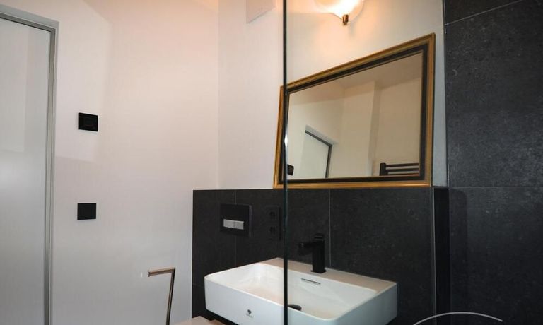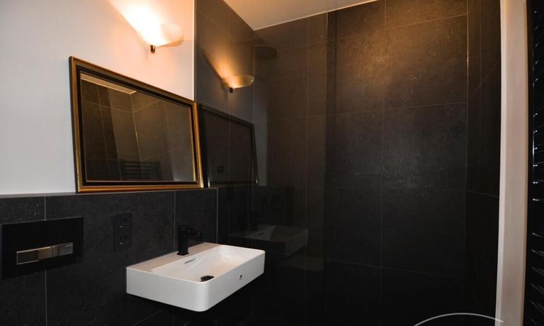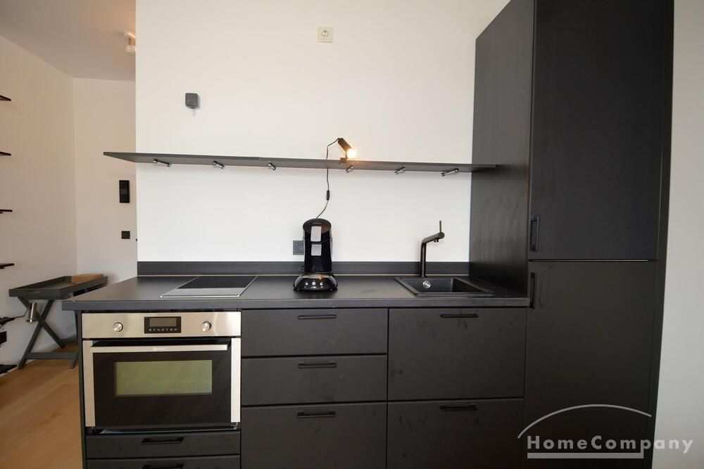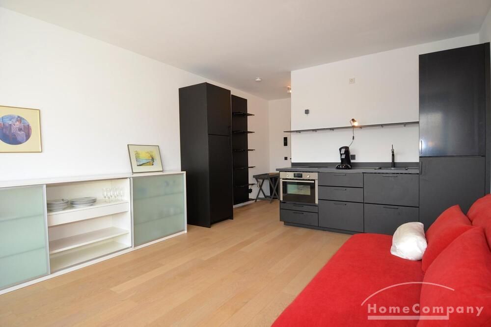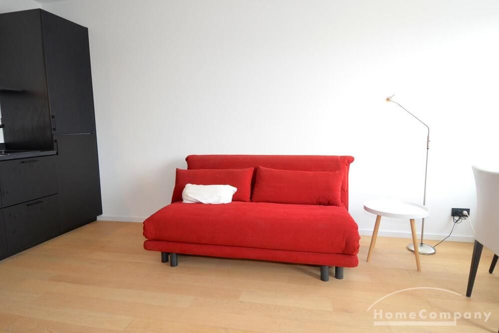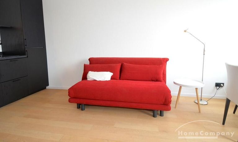 The apartment has a black built-in kitchenette with refrigerator, built-in stove, hob, (no dishwasher) red sofa bed, black desk. white upholstered chair, white sideboard, black wardrobe. open shelf, comfortable armchair.