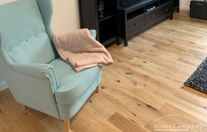 New laminate flooring is installed in all three rooms. The bedroom has a large 2x2m bed.