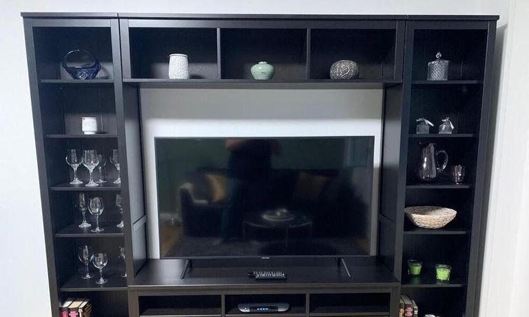 In addition to the wardrobe and glass table, there is also a TV here. The kitchen is totally modern in white with black tiled floors and fully equipped with all appliances and crockery/cutlery. The bathroom has a large shower and a washing machine.