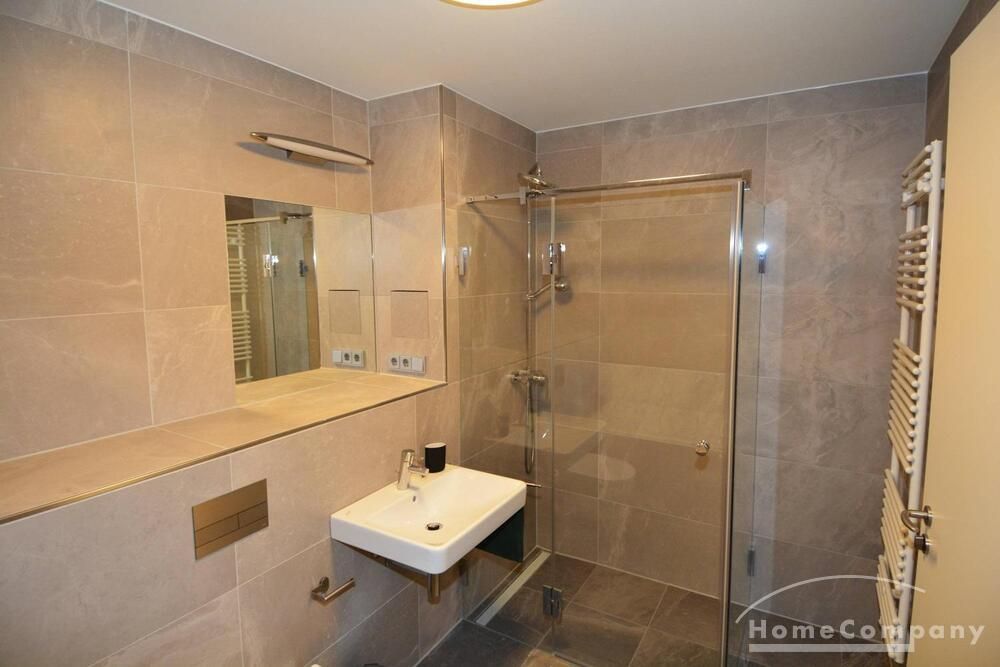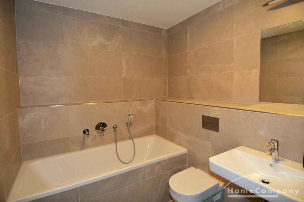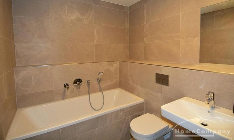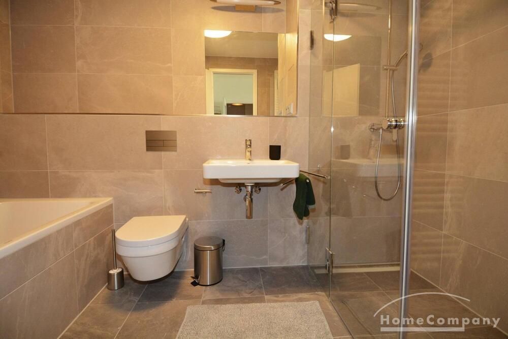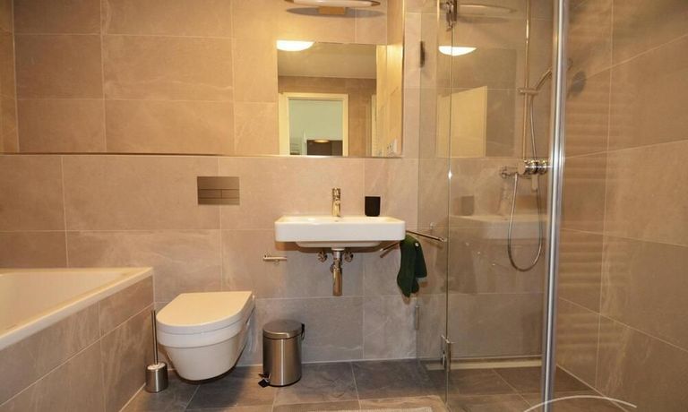 Modern tiled bathroom with shower and tub. Apartment has parquet and underfloor heating throughout.