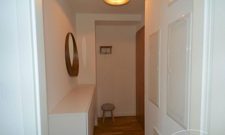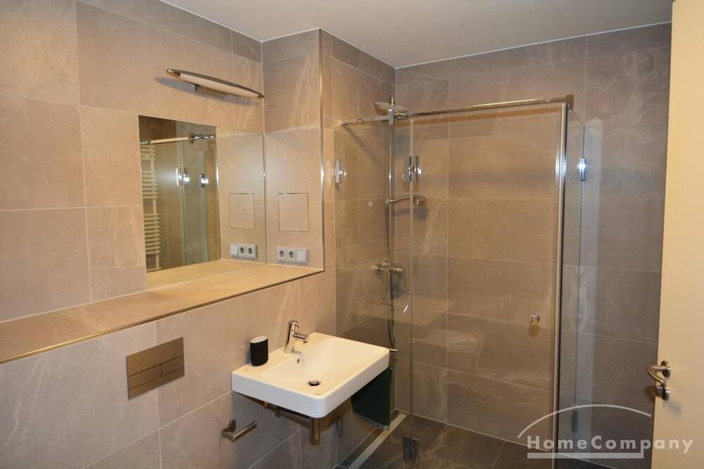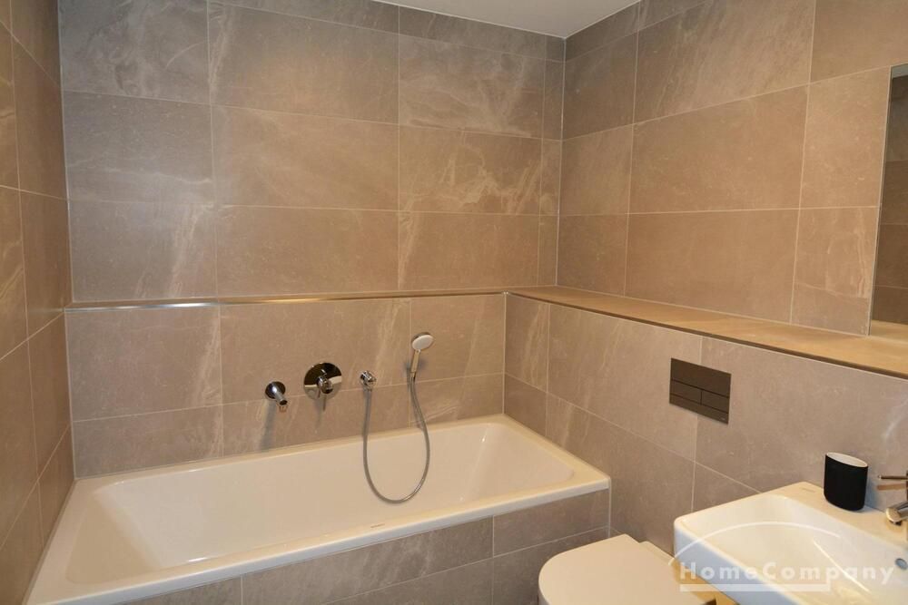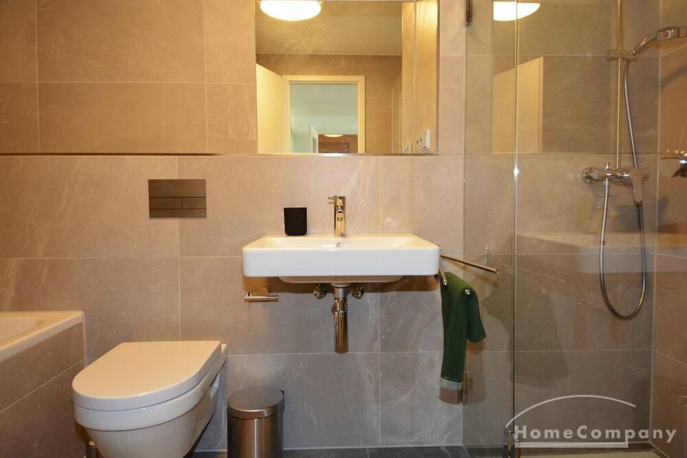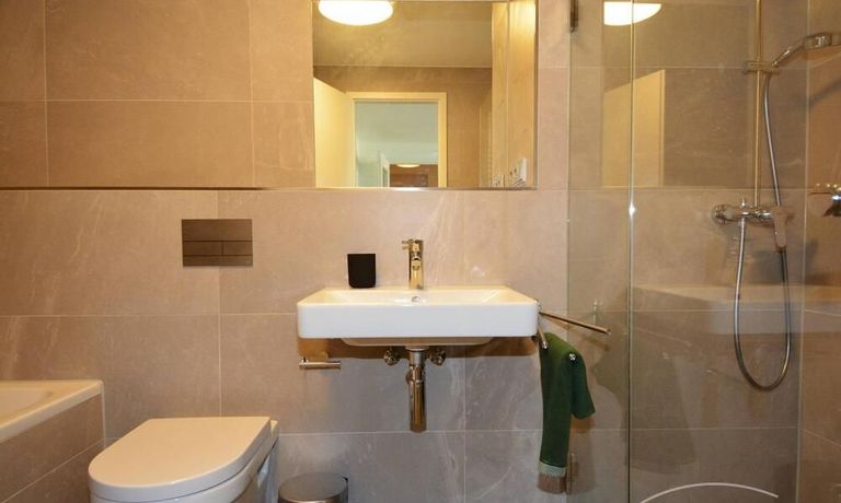 Modern tiled bathroom with shower and tub. Apartment has parquet and underfloor heating throughout.