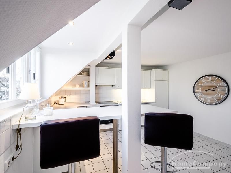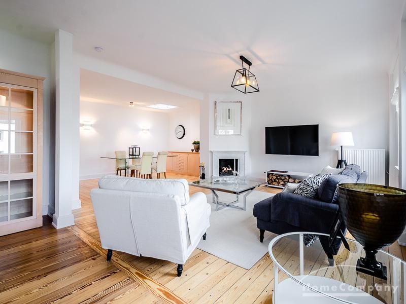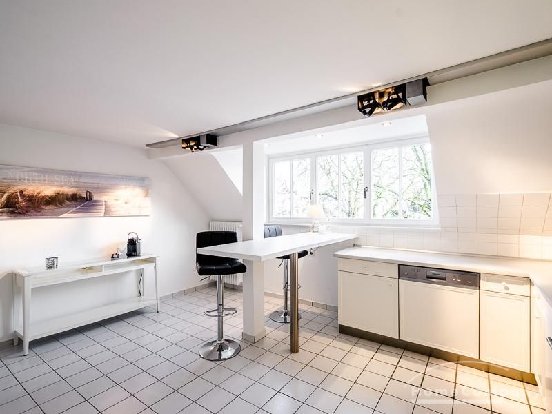 The spacious living room with bright upholstered furniture and 58 inch Samsung TV merges into the dining room with original skylight. The living room has a working fireplace. One of the bedrooms is equipped with a 1.80 m wide box spring bed and plenty of room in the wardrobe. From here, the balcony, which is oriented towards the beautifully landscaped garden, can be reached. The second bedroom has a 1.40 m wide boxspring bed. The generously sized kitchens include a breakfast bar.