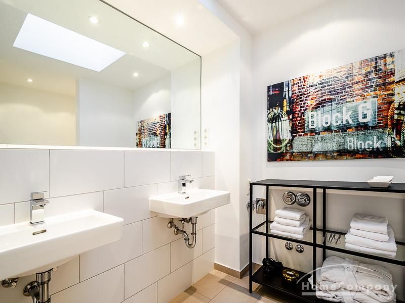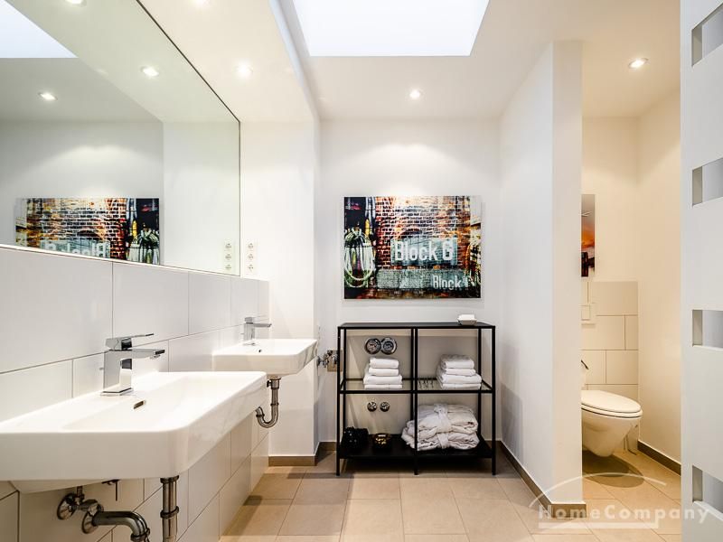 The bathroom is equipped with two vanities, a shower and a separate toilet. From the hallway is a walk-in closet with shoe rack.