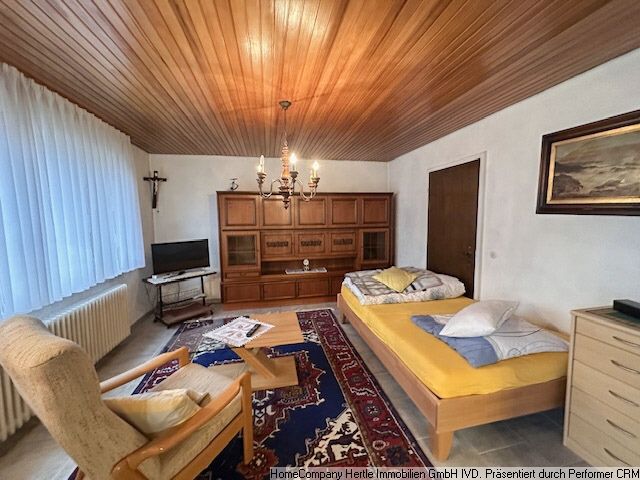 Single bed, armchair, small coffee table, side table with TV, wooden wall unit, Wooden chest of drawers and various decorations