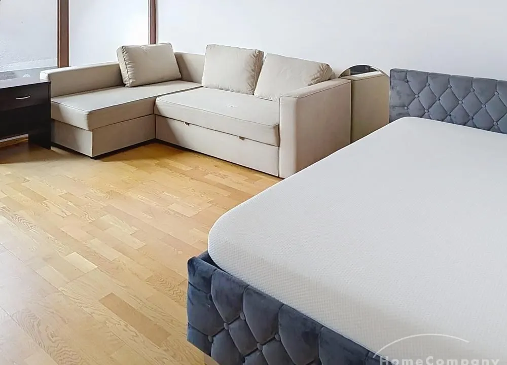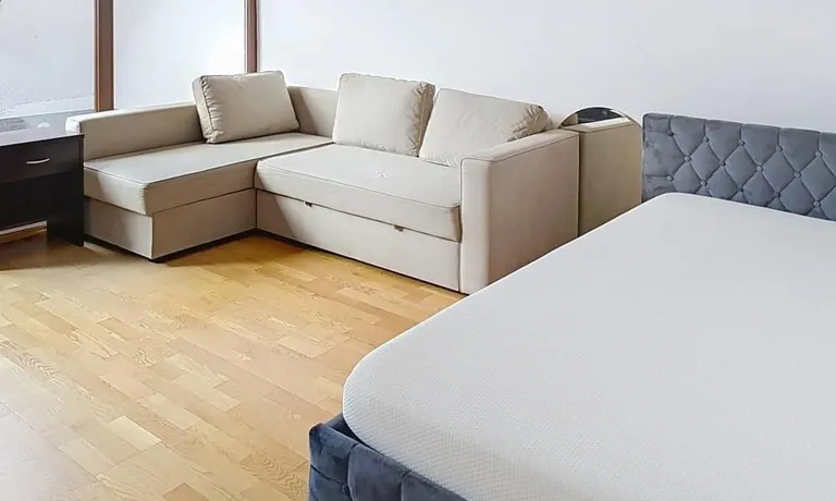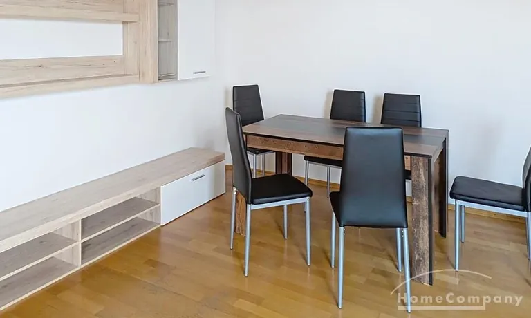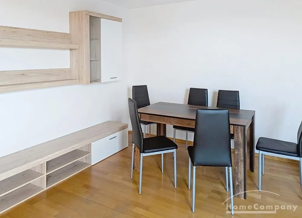 The apartment is fully furnished, including sofas, beds (double and queen-size), storage furniture and a dining table with seating for six.