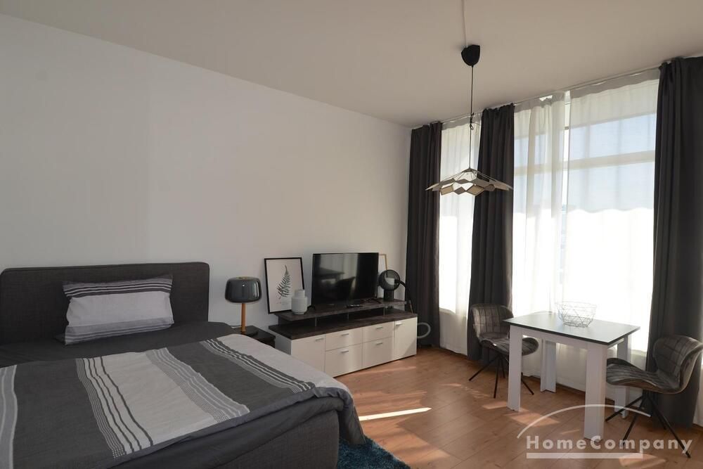 Welcome to this charming one-bedroom apartment in Mitte! Flooded with an abundance of natural light, it offers a bright and inviting atmosphere. The apartment comes fully furnished with a cozy bed, a convenient table, and a washing machine for your comfort. The modern tiled bathroom features a refreshing shower, while the hallway boasts a spacious wardrobe.