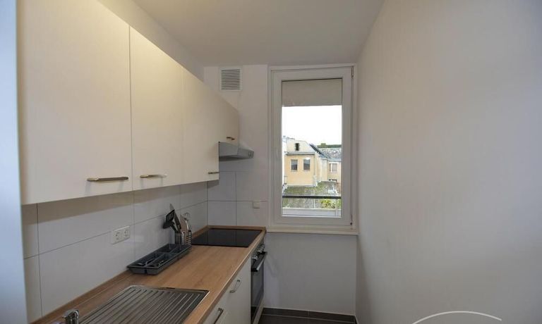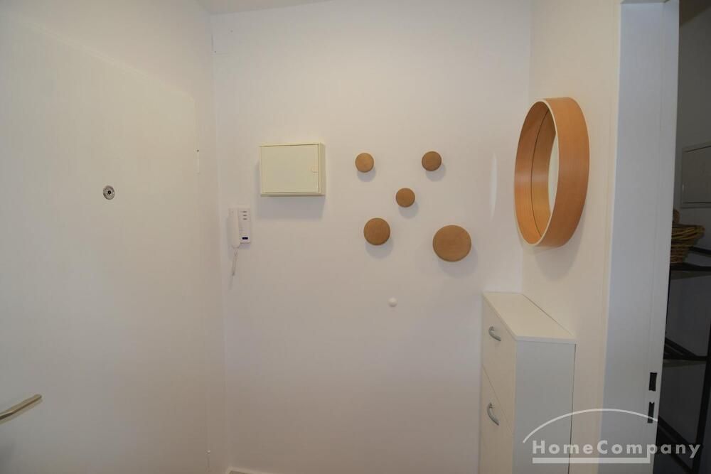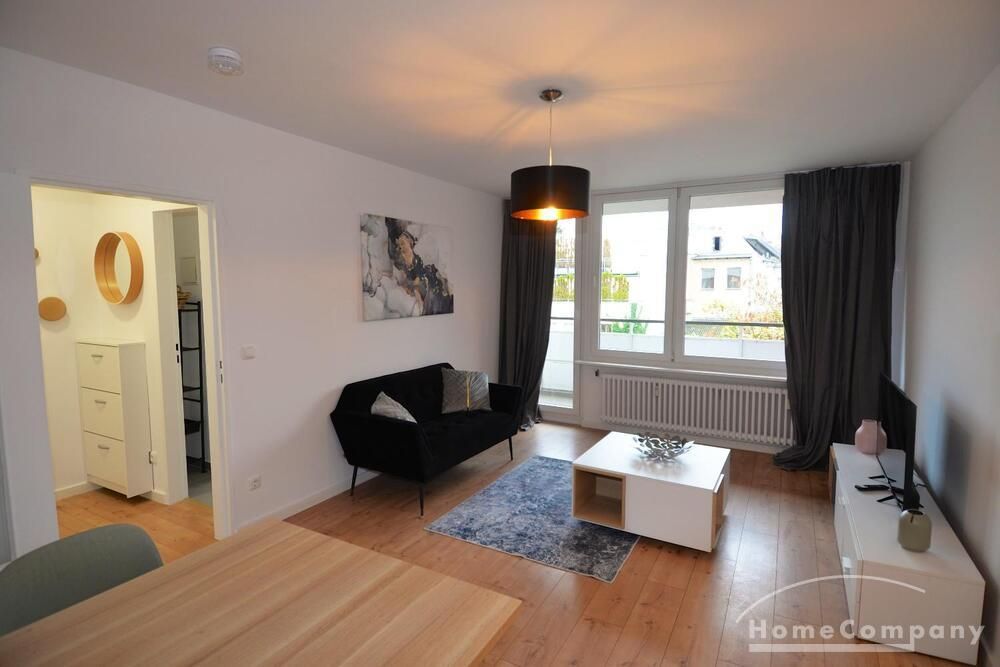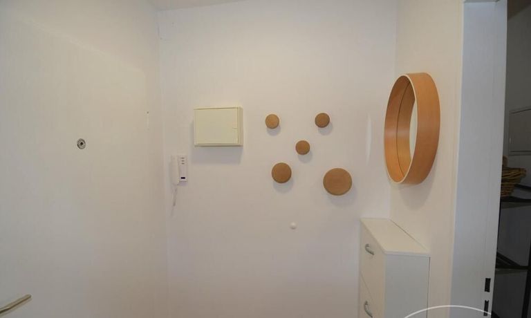 Living room with couch, table and dining area and access to the large balcony. Bedroom with box spring bed and closet. Modern tiled bathroom with shower and washing machine. The large hallway offers plenty of storage space. Large balcony with seating.