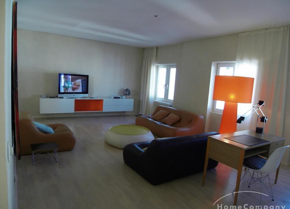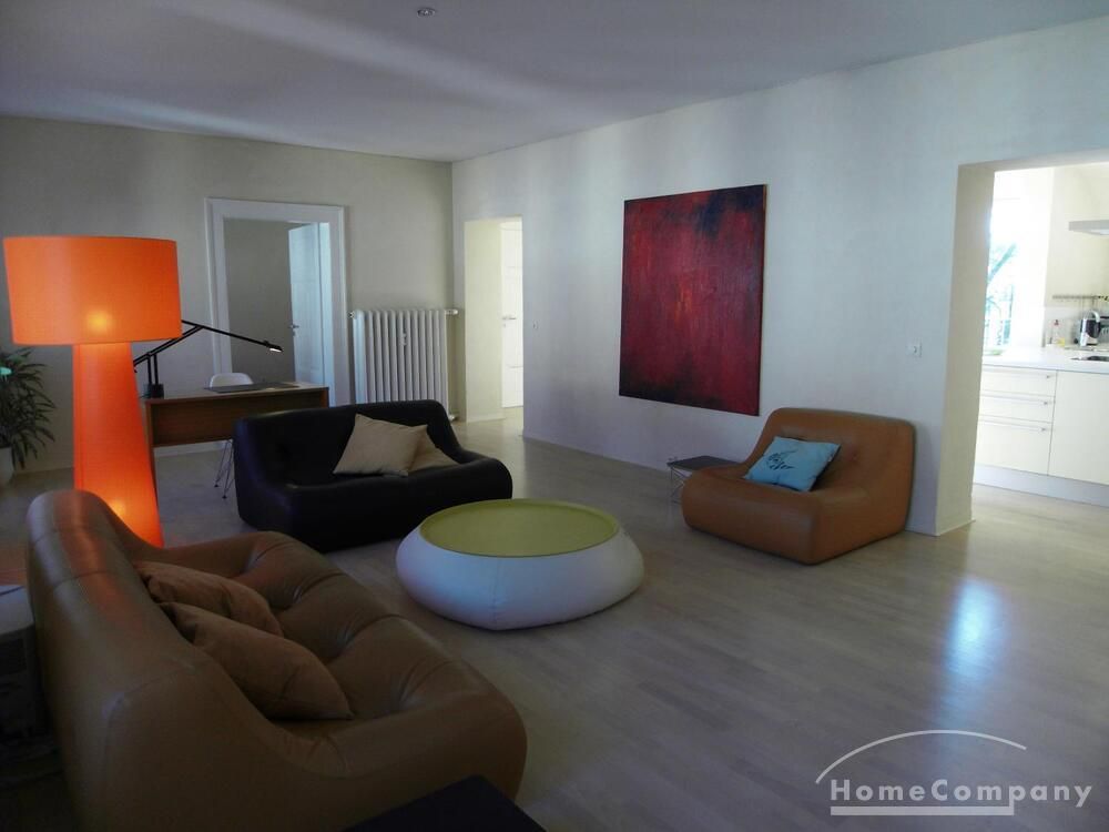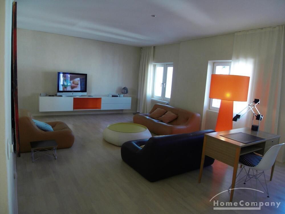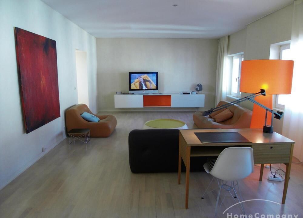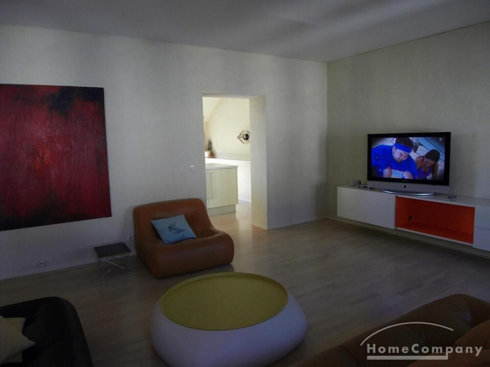 The living room has two leather sofas and a leather chair with a coffee table, a large hanging sideboard with digital satellite TV with flat screen TV, a stereo system (Bose), a desk with chair (Eames), a desk lamp (Megaron), and a large design floor lamp. Internet included.