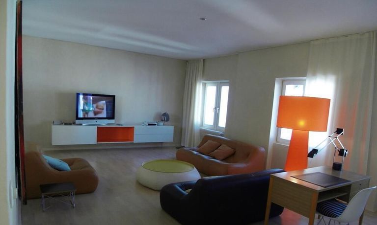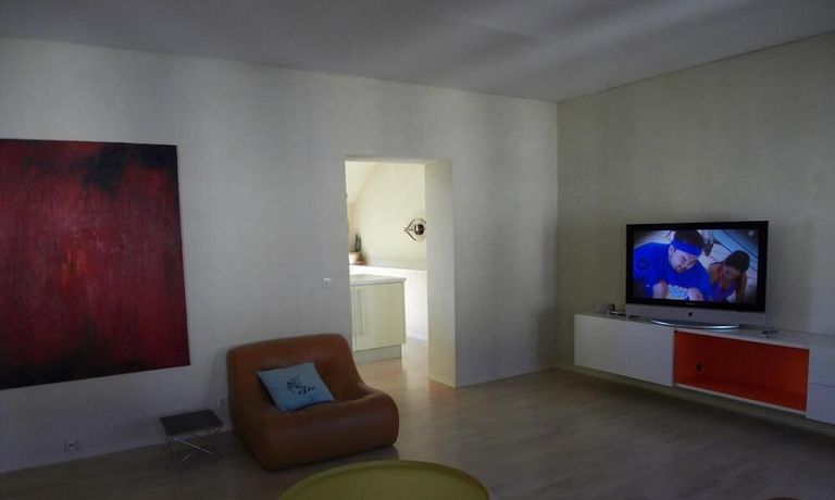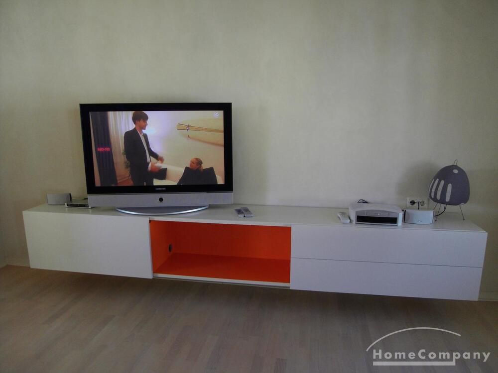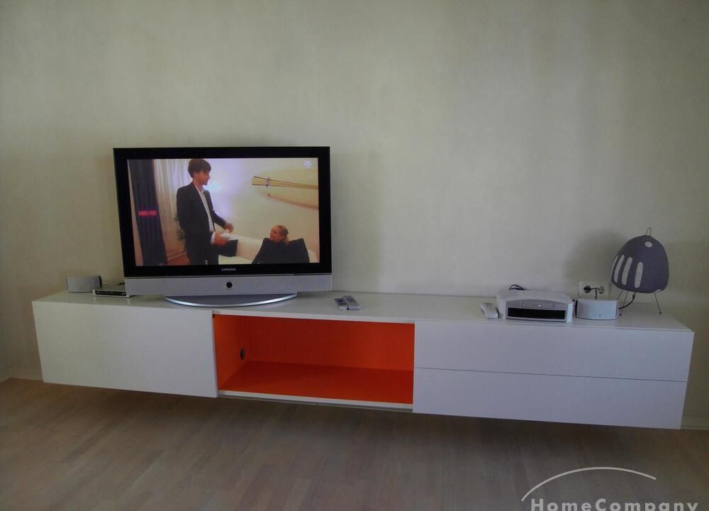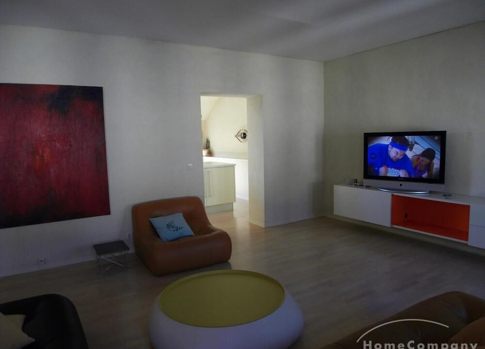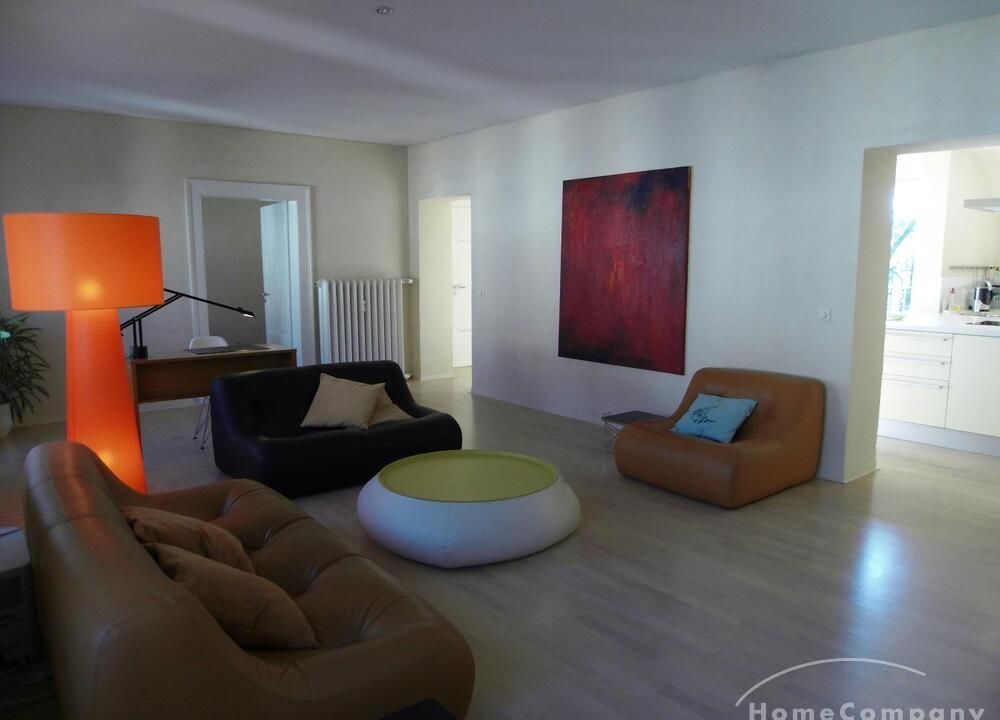 The living room has two leather sofas and a leather chair with a coffee table, a large hanging sideboard with digital satellite TV with flat screen TV, a stereo system (Bose), a desk with chair (Eames), a desk lamp (Megaron), and a large design floor lamp. Internet included.