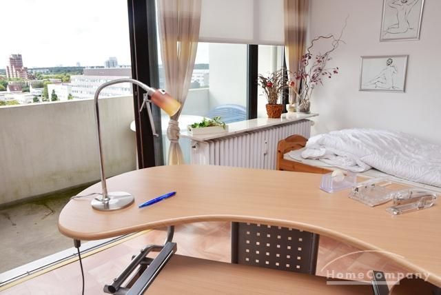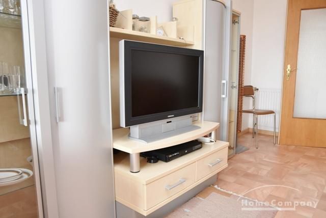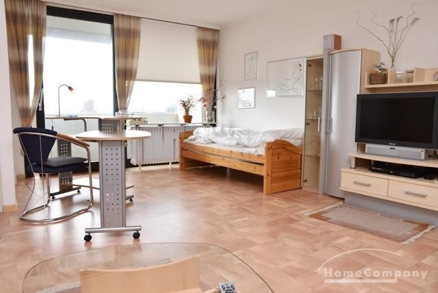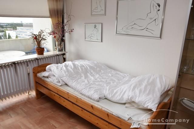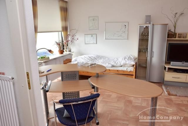 Living/sleeping room with single bed, cable TV, HiFi, desk, leather studio couch, table.