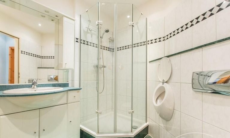 The bedroom is equipped with a comfortable double bed, providing plenty of space to relax. The modern bathroom includes a convenient corner shower.