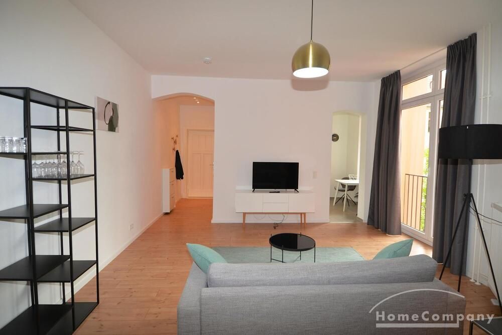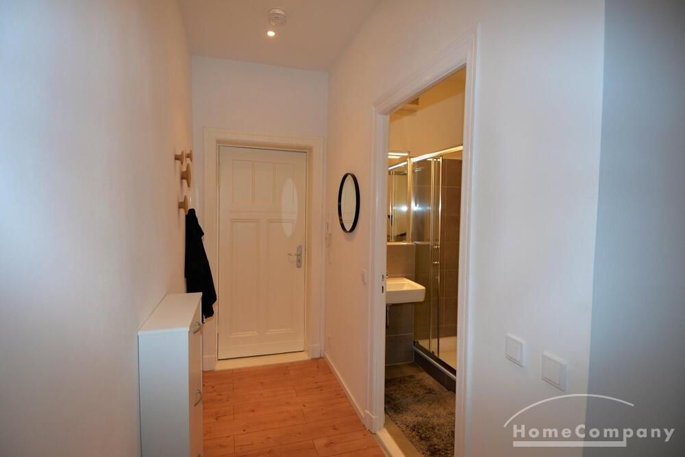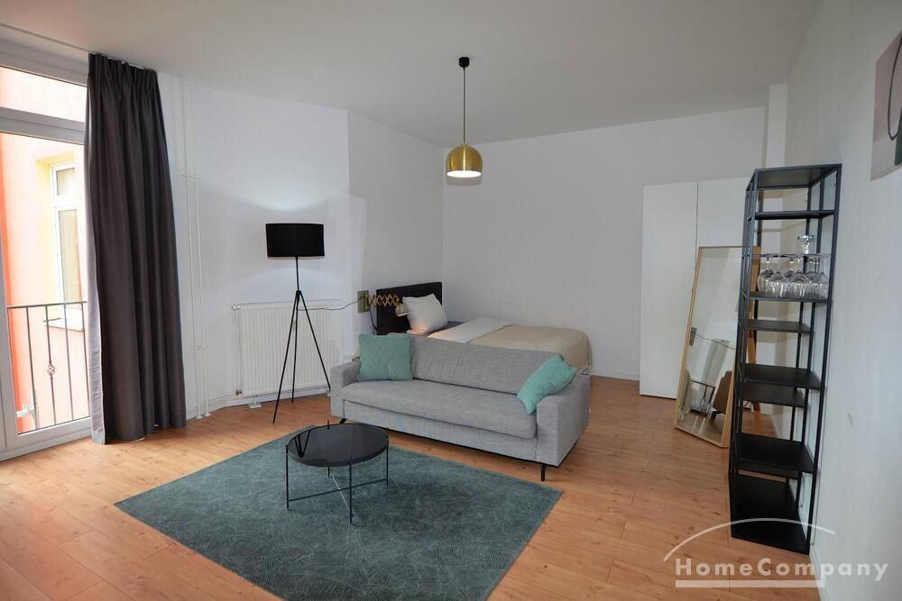 Beautiful 1 room apartment in Berlin Mitte. The apartment is equipped with a double bed, a TV, a floor lamp, a desk and a large window. The bathroom has a shower and a toilet.