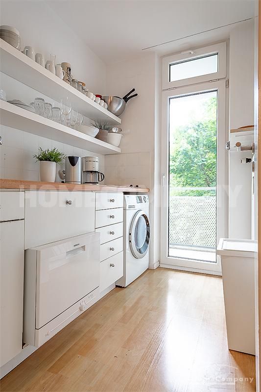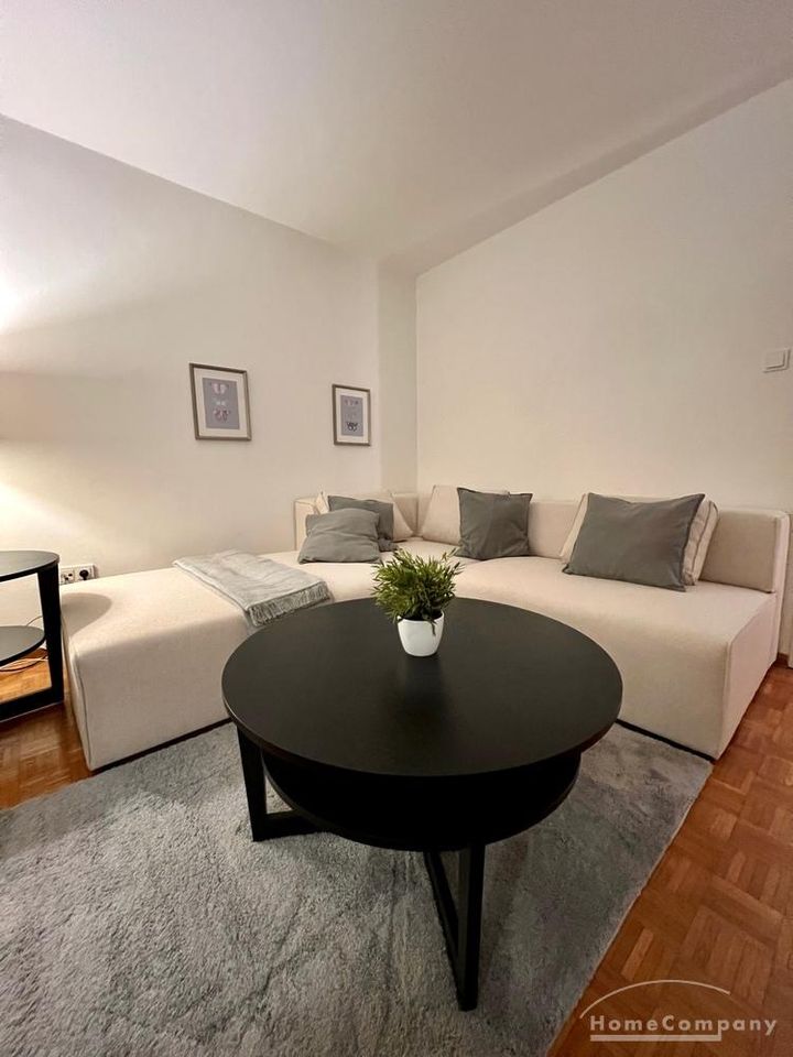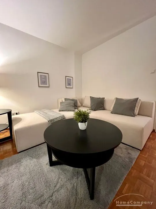 Sunny, modernly furnished 3-room flat with balcony, very centrally located in the heart of Schwabing but also quiet in the rear building. 5th floor with lift. Large living room with light-coloured angle-type sofa, bedroom with double bed. A further sleeping facility in the guestroom. The small fitted kitchen with dishwasher and microwave offers access to the south-balcony. Flooring: Parquet and laminate. Washing mashine for joint-use in the loundrette of the house. All shops, restaurants, cafés etc. as well as public transport in immediate reach.