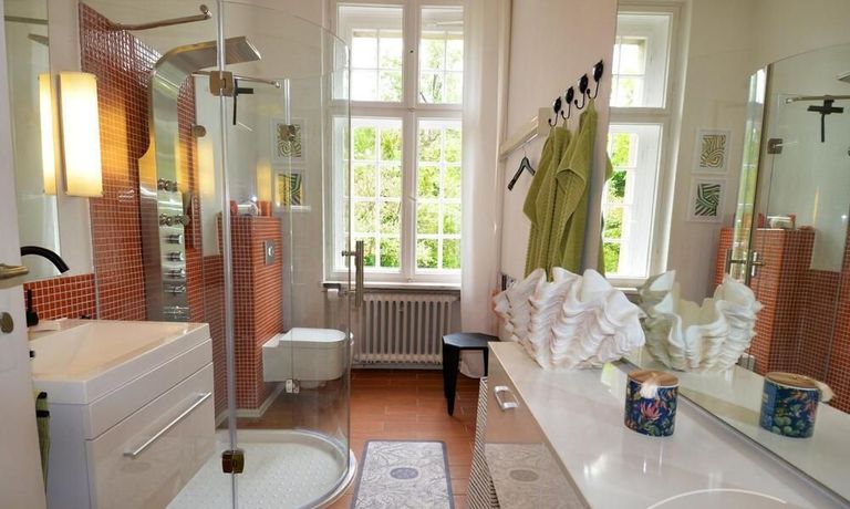Tasteful daylight bathroom, shower with a view of the idyllic garden with a large dining table for use, parking space directly at the house possible, if required, another parking space can be rented.