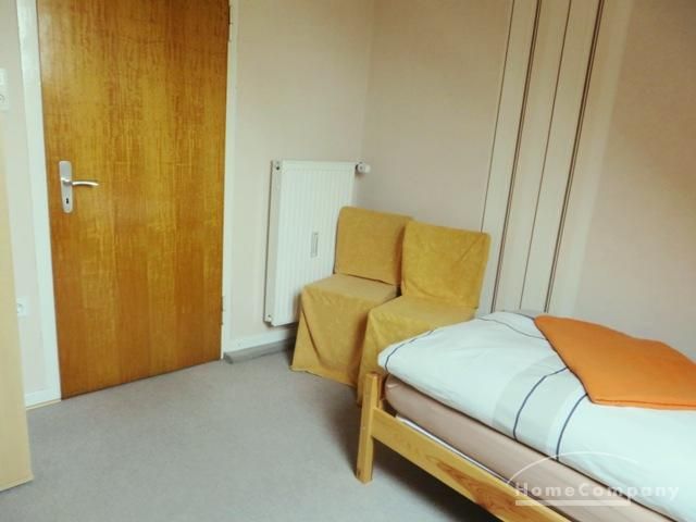 Bedroom with single bed, wardrobe, bedside locker, small table, chair, linoleum, 2 small carpets.