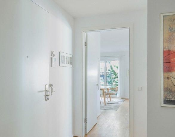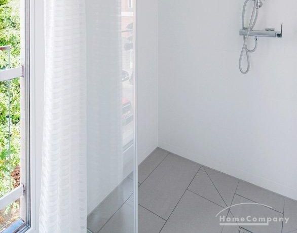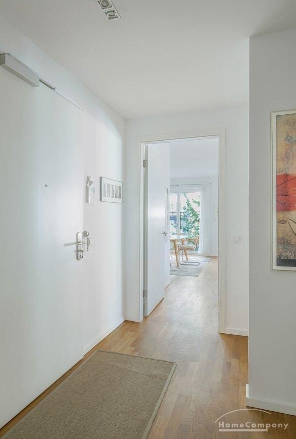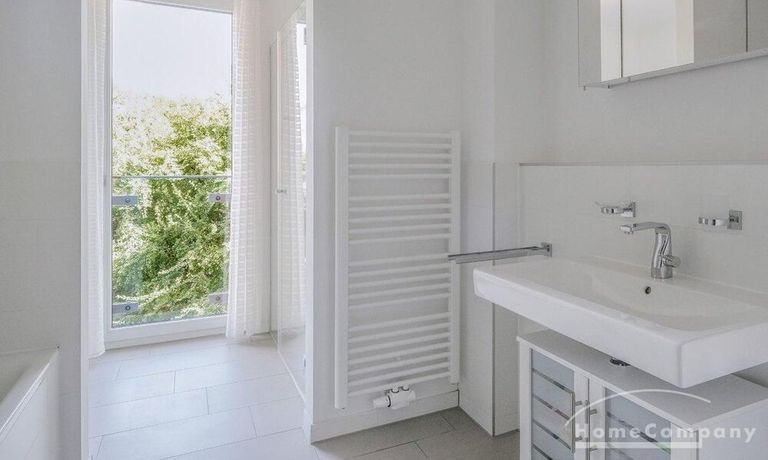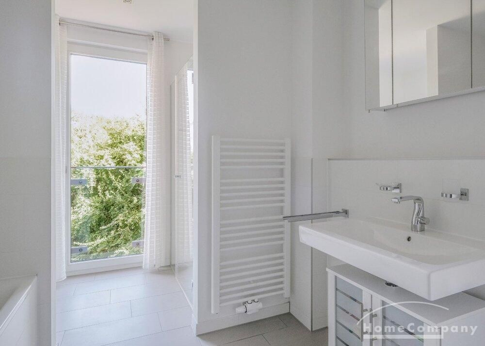 High-quality parquet flooring by Bauwerk lends the rooms a warm ambiance and timeless elegance. The naturally lit bathroom features a walk-in shower as well as a bathtub and impresses with its top-class fittings. Floor-to-ceiling windows with triple glazing ensure peace and quiet while creating a bright and airy living space.