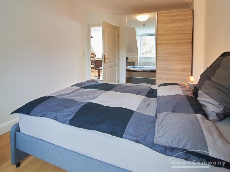 The apartment impresses with its beautiful sloping ceilings with attractively designed dormers for the windows. The modern furnishing with industrial elements supports the generous spatial effect, special accents can be set with a smart home lighting system.