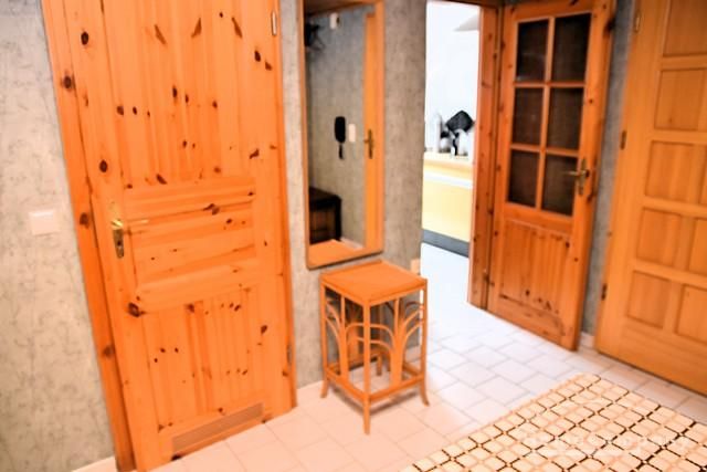 Hallway/dining area with table and 2 chairs, cloakroom.
