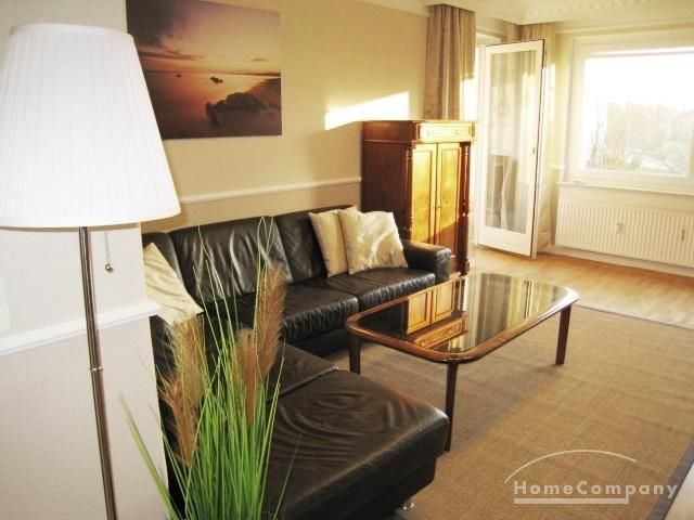 Living room with leather couch, couch table, vertico, HiFi-rack, flat-TV, cupboard, access to