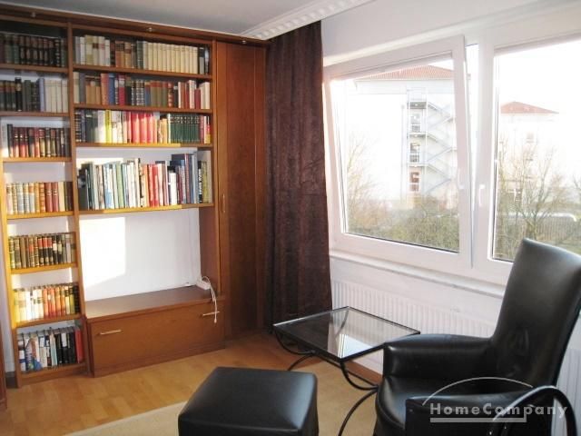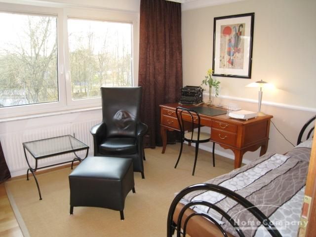 2nd sleeping room with single bed, writing desk, chair, leather armchair with stool, side table, shelf wall with cabinet part and TV.