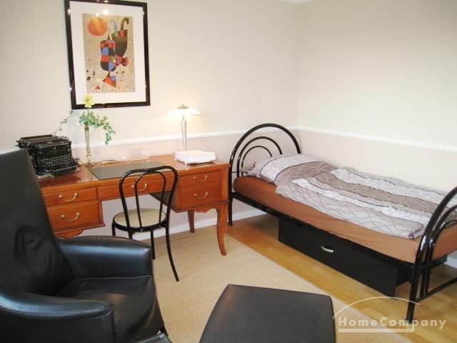 3rd sleeping room with single bed, bedside table, armchair with stool, chest of drawers, wardrobe.