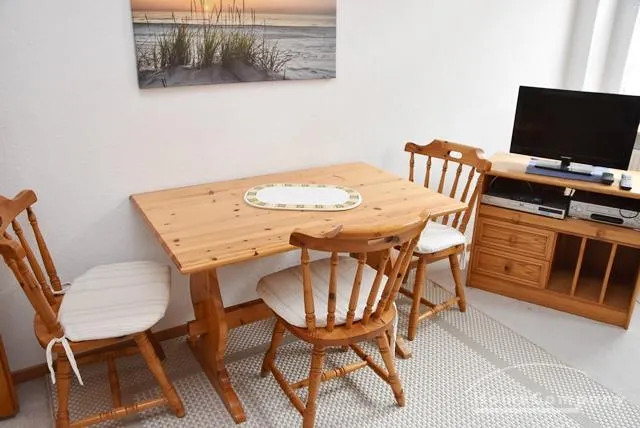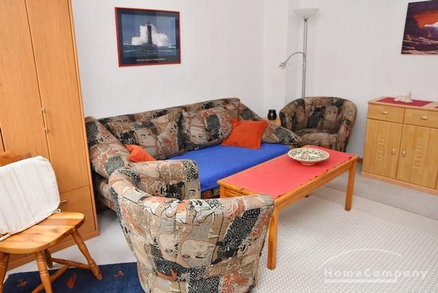 Living room of 16 sqm with sleeping sofa, coffee table, 2 armchairs, sideboard, Sat TV, dining table and 3 chairs.