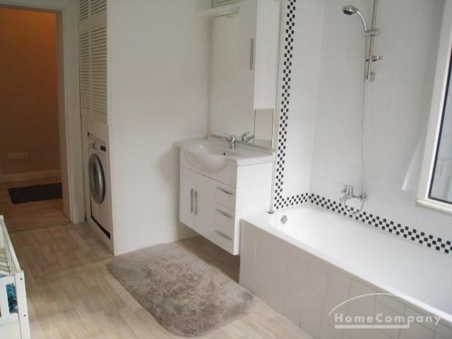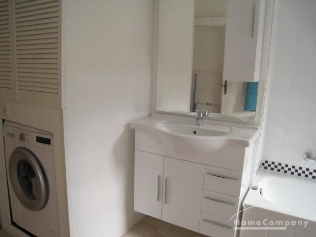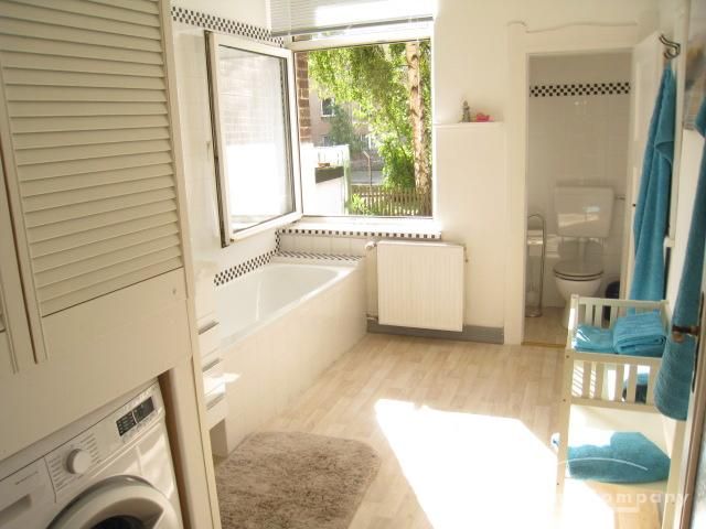 Bathroom with washing machine, separate toilet.