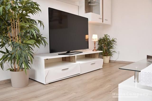 Sitting room with white corner sofa, coffee table, wall unit, flat screen TV