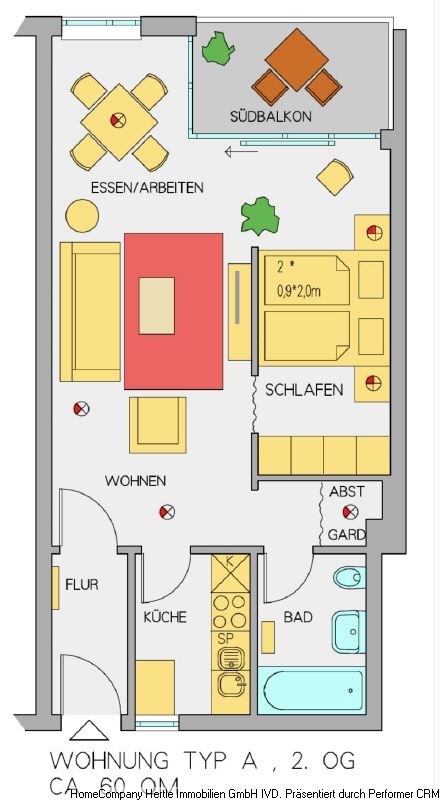 Through the hallway you enter the spacious living-dining room, in front of the living room is the covered, furnished south-facing balcony.