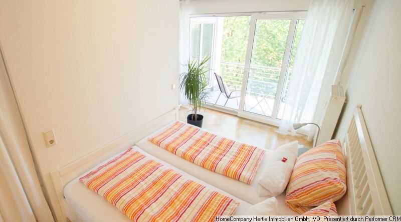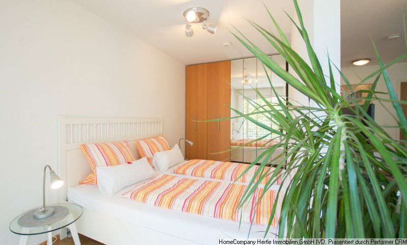 The living room is adjoined by the separate sleeping area with a double bed and large closet, partially mirrored.