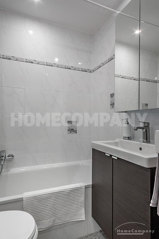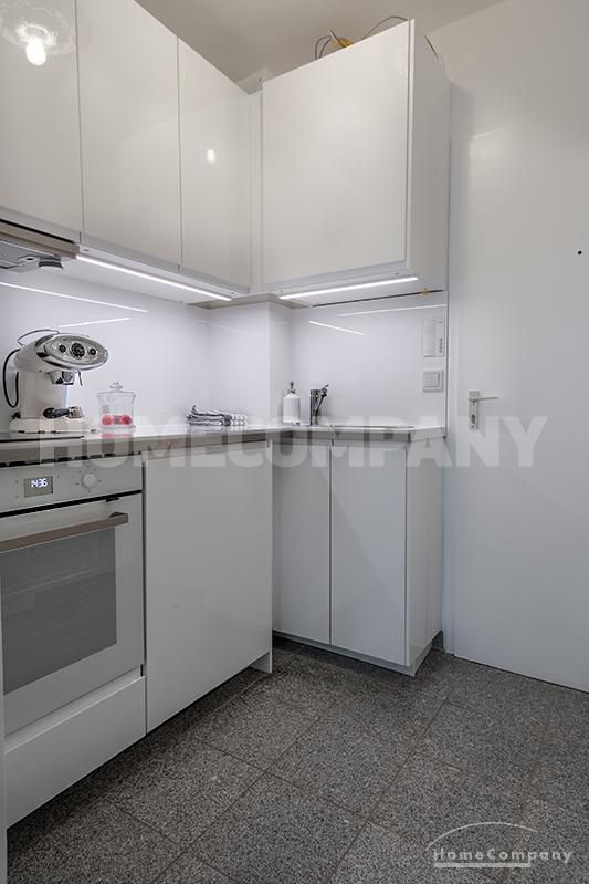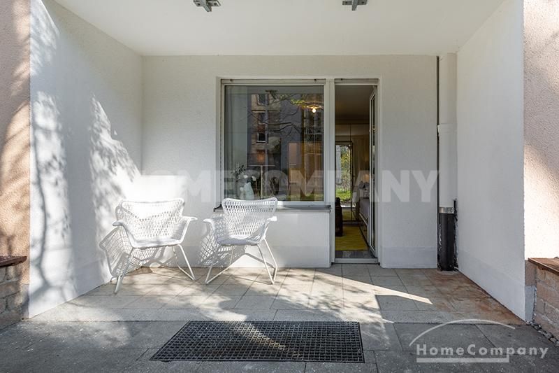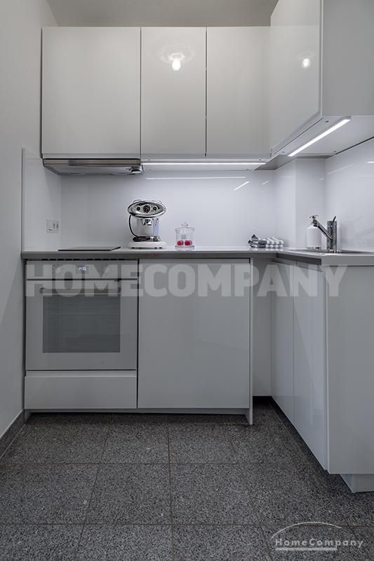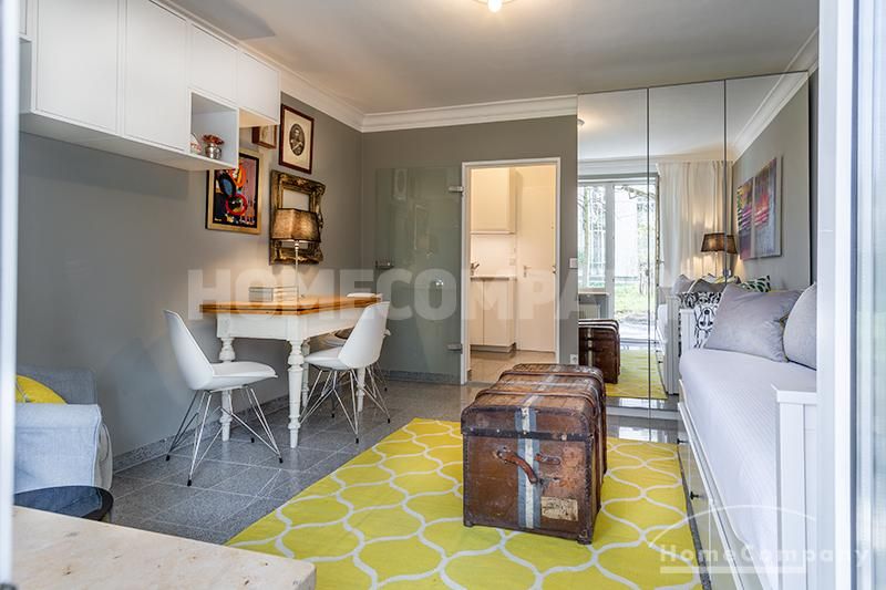 Modernly furnished 1-room-apartment with terrace in Schwabing. Ground floor. The attractive and stylish living-/bedroom offers a daybed, dining area for up to 3 persons as well as a wardrobe. From here access to the furnished terrace.