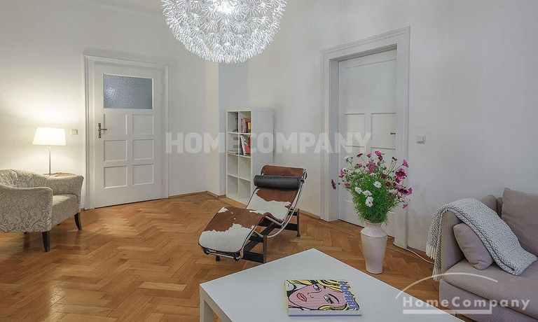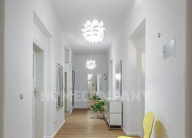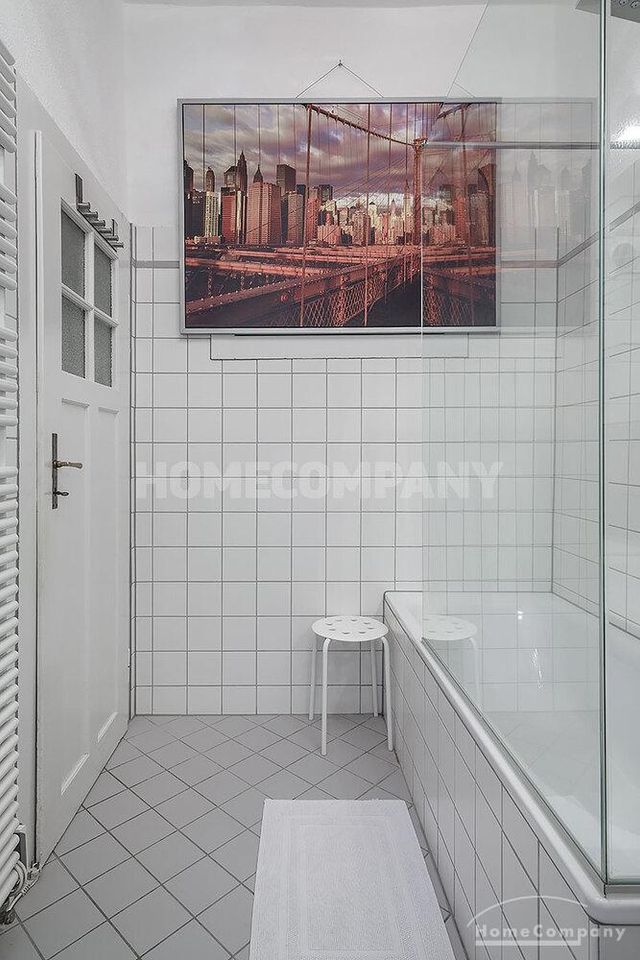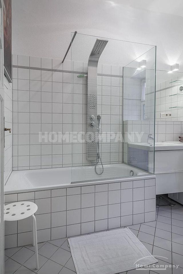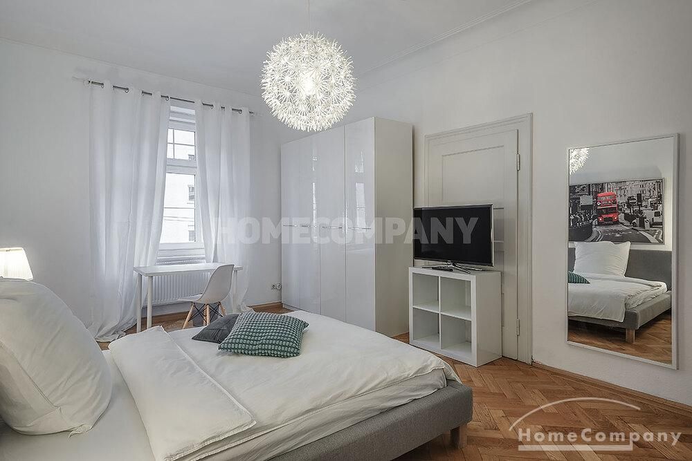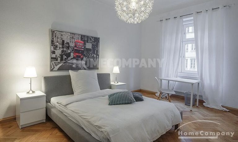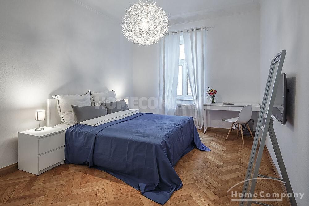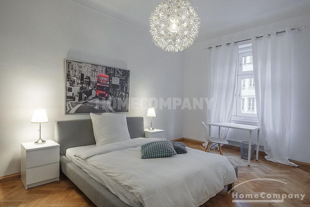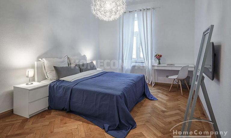 Furnished 4 -room flat with balcony and 2 bathrooms in Munich- Neuhausen. The flat is on the 1st floor. Large living room with 2 sofas, flat screen TV and reading corner. There are three bedrooms available. The master bedroom has a double bed (180×200 cm), wardrobe, flat screen TV and a working space. The other two bedrooms have two single beds (120×200 cm), flat screen TV, wardrobe and a working space. On request it is possible to reduce the number of single beds. Eat-in kitchen with refrigerator, microwave, ceramic hob and oven, dishwasher, dining table for 4 people and access to the balcony. In the flat there are two bathrooms with bathtub and heated towel rail – one with toilet, washing machine and window. Extra WC also available. An additional clothes dryer is located in the utility room, which is accessible from the corridor. Flooring: parquet in the living/bedrooms, linoleum in the kitchen, tiles in the bathrooms. An Internet flat is included in the rent. An underground parking space is available upon request for plus 120.00 EUR per month. GEZ (TV licence) and municipal utilities must be registered by the tenant. Rent does not include electricity and heating. Pets are allowed. Shops, restaurants, bars, cafes etc. as well as public transport nearby.