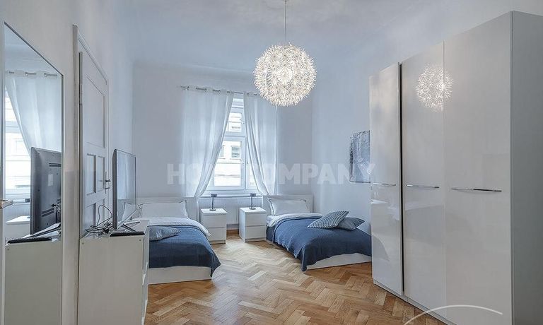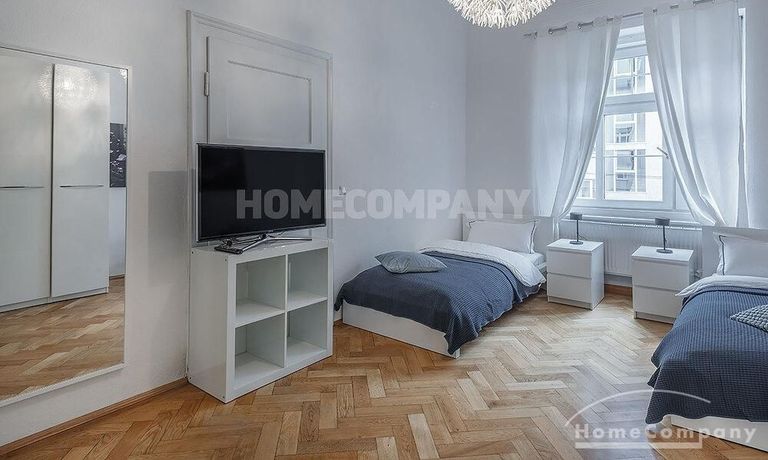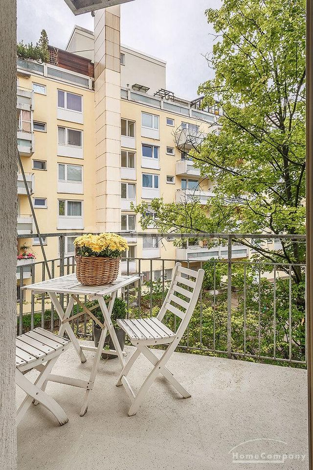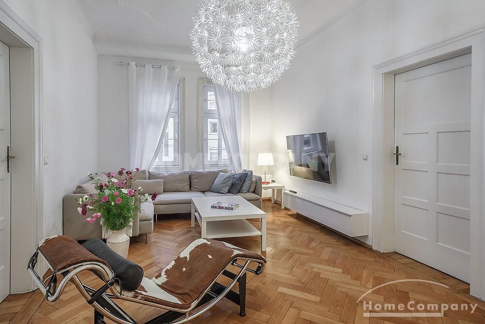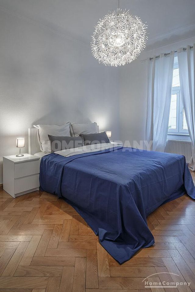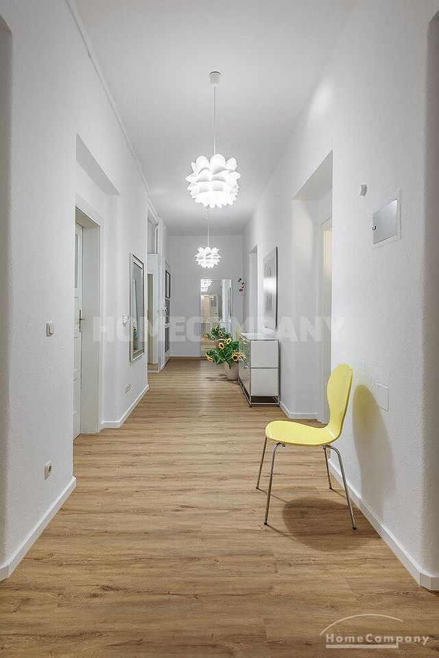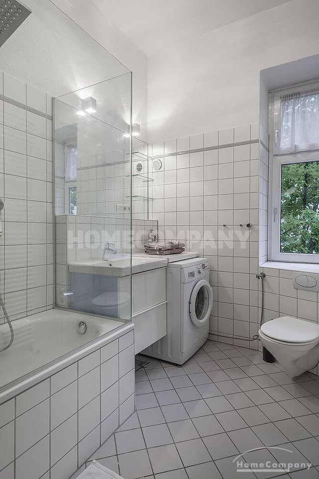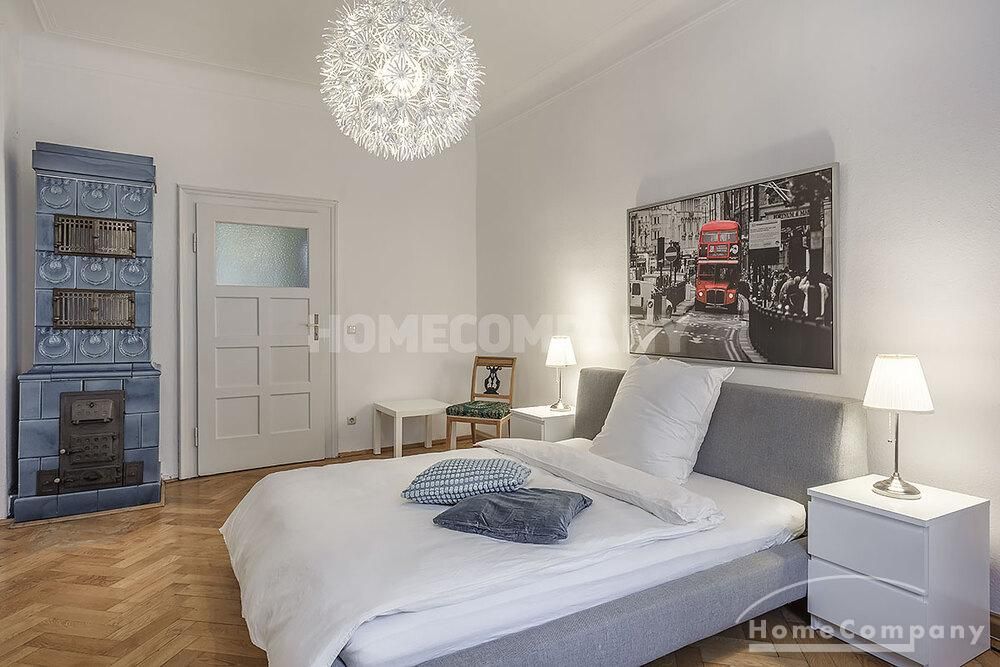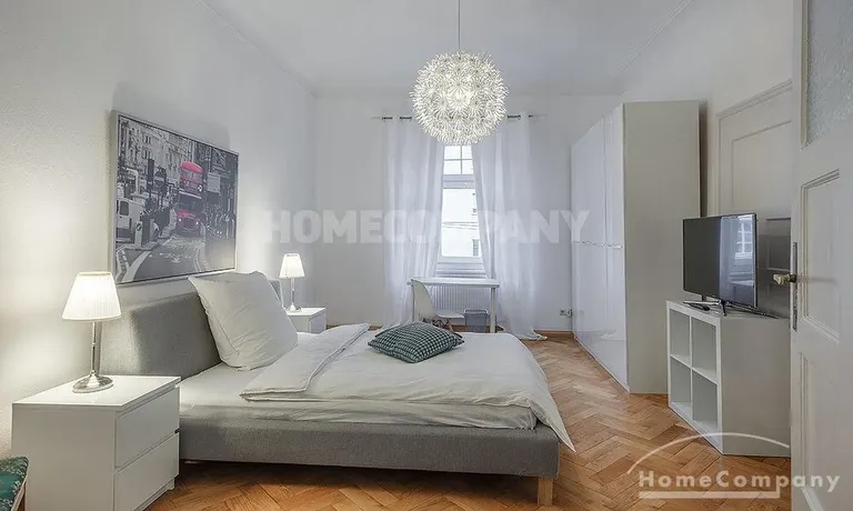 Furnished 4 -room flat with balcony and 2 bathrooms in Munich- Neuhausen. The flat is on the 1st floor. Large living room with 2 sofas, flat screen TV and reading corner. There are three bedrooms available. The master bedroom has a double bed (180×200 cm), wardrobe, flat screen TV and a working space. The other two bedrooms have two single beds (120×200 cm), flat screen TV, wardrobe and a working space. On request it is possible to reduce the number of single beds. Eat-in kitchen with refrigerator, microwave, ceramic hob and oven, dishwasher, dining table for 4 people and access to the balcony. In the flat there are two bathrooms with bathtub and heated towel rail – one with toilet, washing machine and window. Extra WC also available. An additional clothes dryer is located in the utility room, which is accessible from the corridor. Flooring: parquet in the living/bedrooms, linoleum in the kitchen, tiles in the bathrooms. An Internet flat is included in the rent. An underground parking space is available upon request for plus 120.00 EUR per month. GEZ (TV licence) and municipal utilities must be registered by the tenant. Rent does not include electricity and heating. Pets are allowed. Shops, restaurants, bars, cafes etc. as well as public transport nearby.
