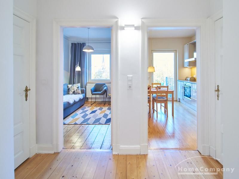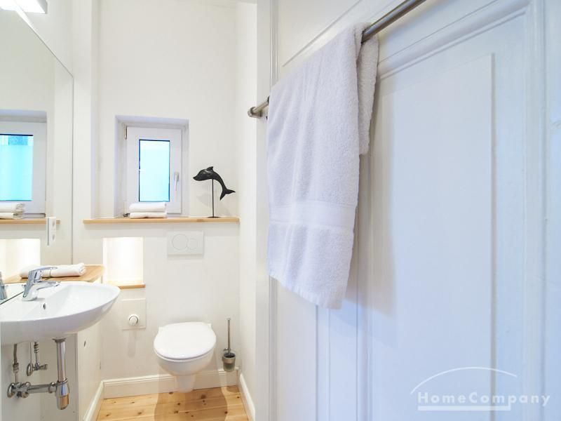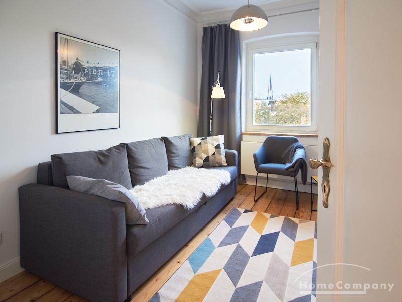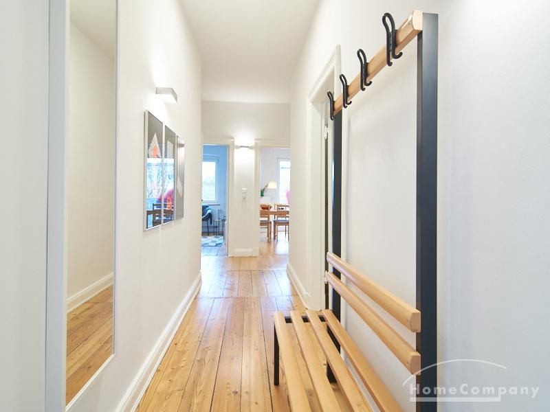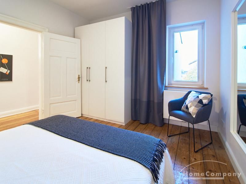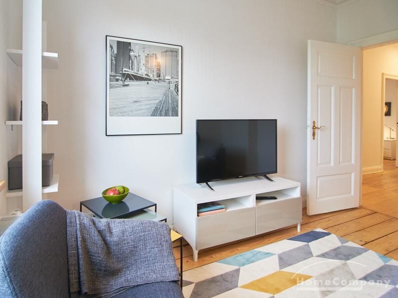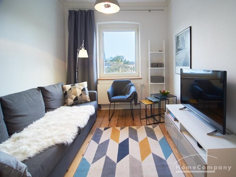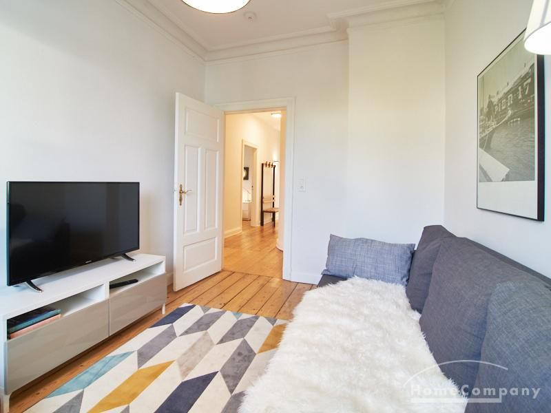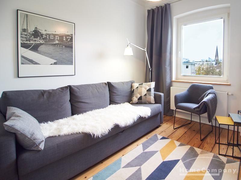 Nice flat in an old building close to the Schanzenviertel. The bedroom is equipped with a 1.60 m wide double bed. The wardrobe has adequate storage space. In addition, there is a small desk for the notebook. The living room is furnished with a convirtable sofa, coffee table and TV. In the kitchen is a dining table available. The well-equipped kitchen is fitted with white fronts and a mango-colored panel on the wall. The apartment is decorated in bright shades of gray with white furniture and few parts of yellow decoration.