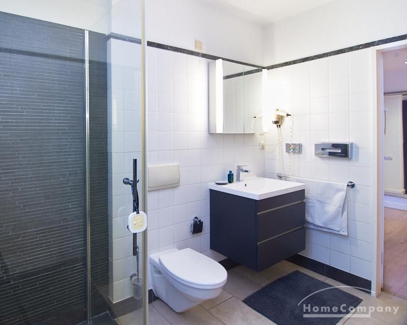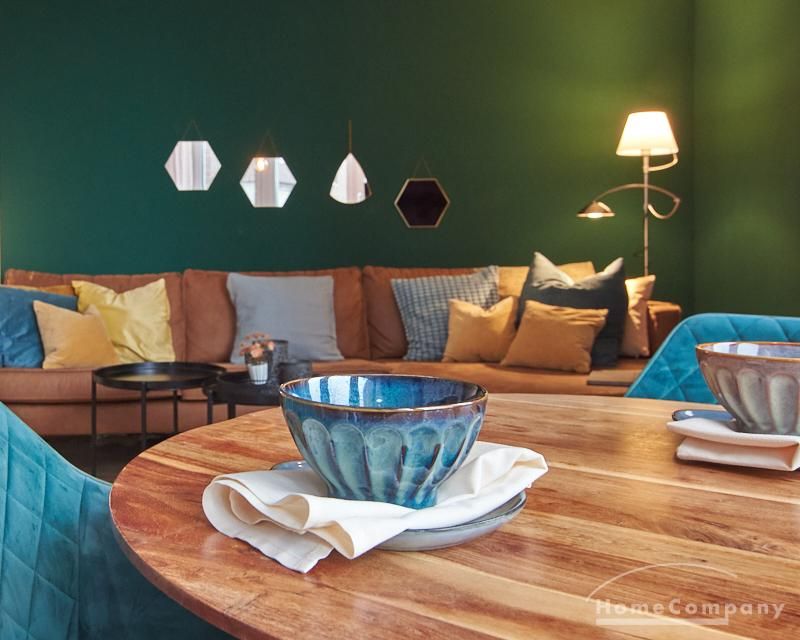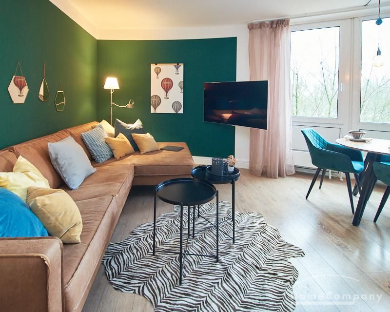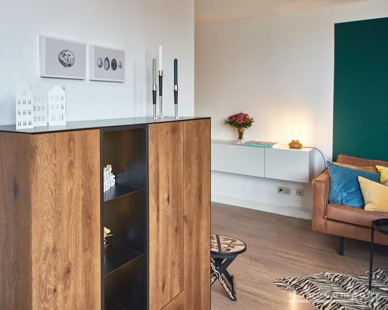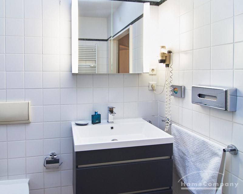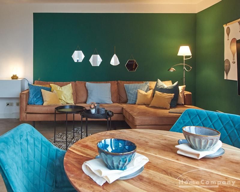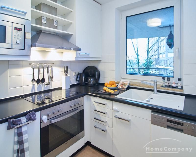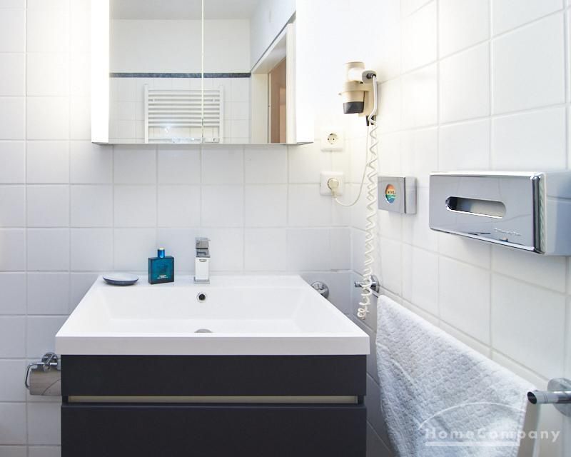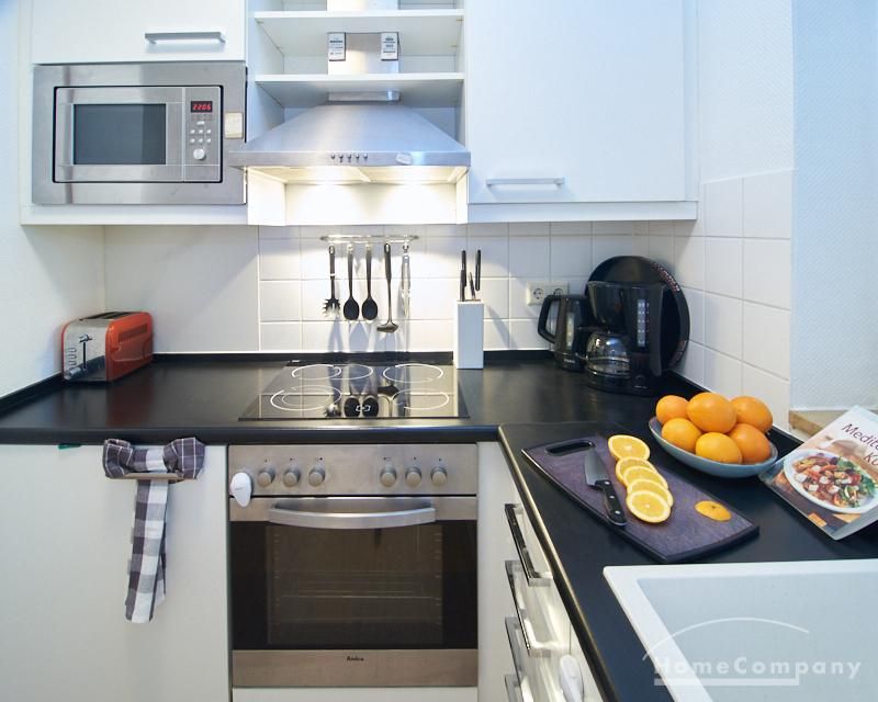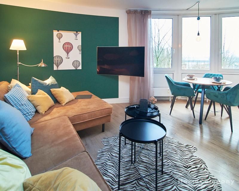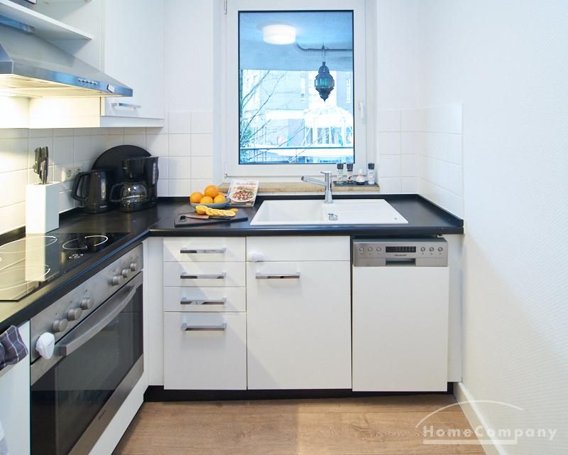 Modern and high-quality furnished apartment in a very central location. The apartment is open plan and has a friendly bedroom with a double bed. The living room is equipped with a comfortable seating area, dining area and a smart TV with installed entertainment package (Waipu, more than 290 TV channels) and is connected to the kitchen via a sliding door. Coin-operated washing machines and dryers are available in the house.