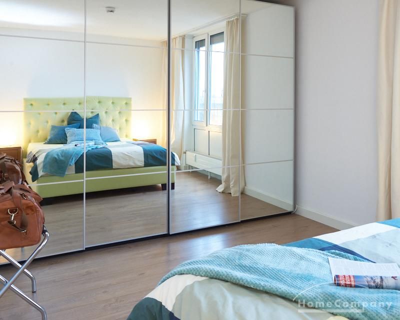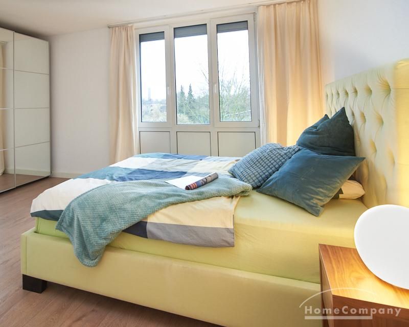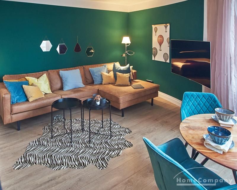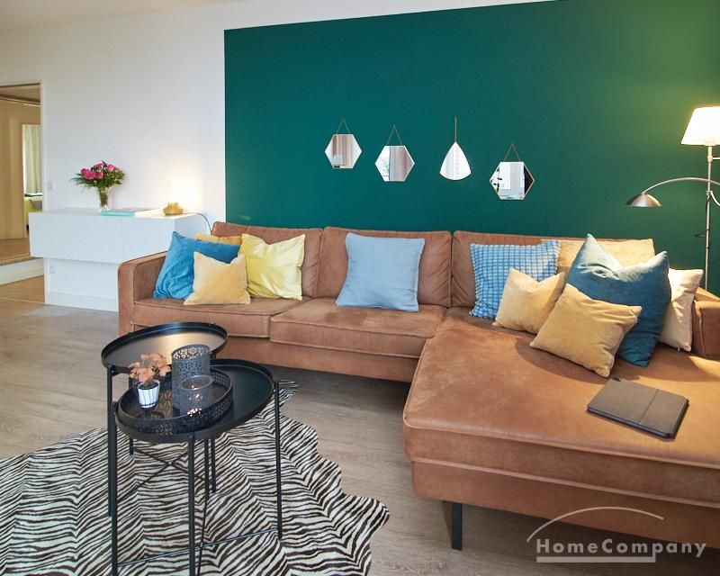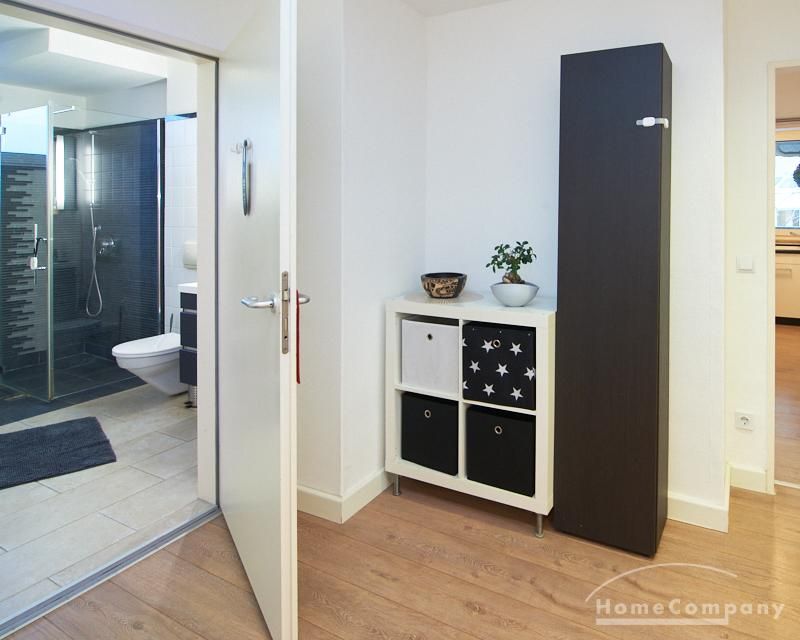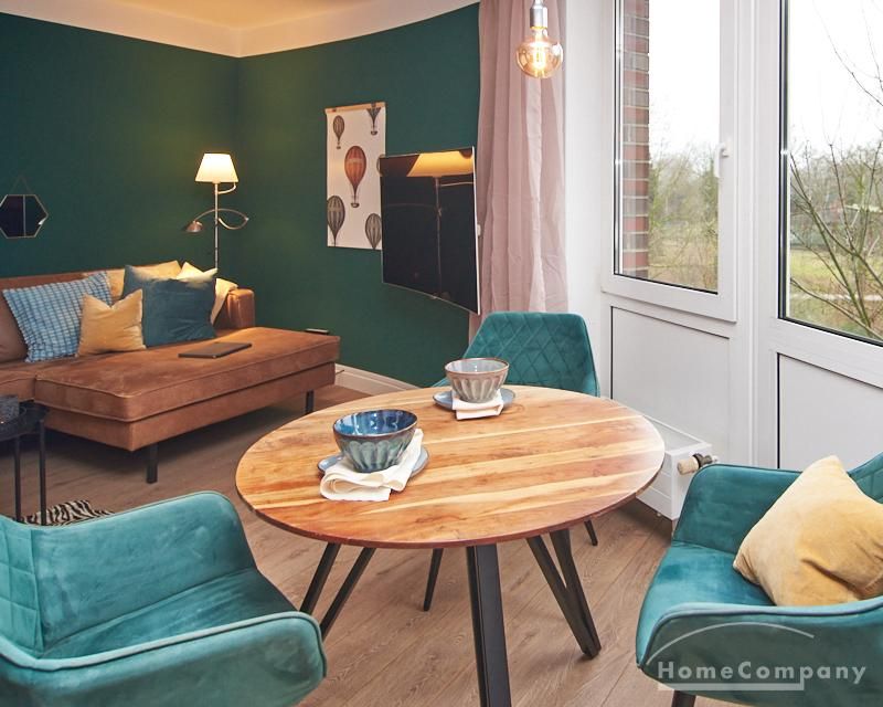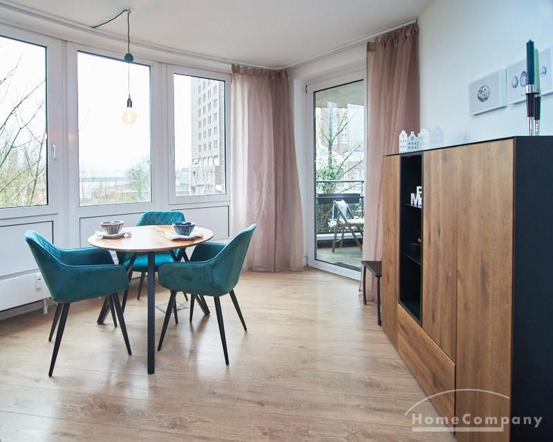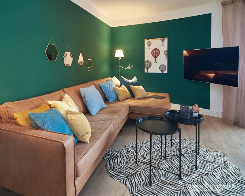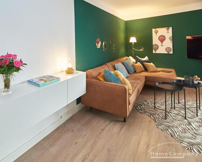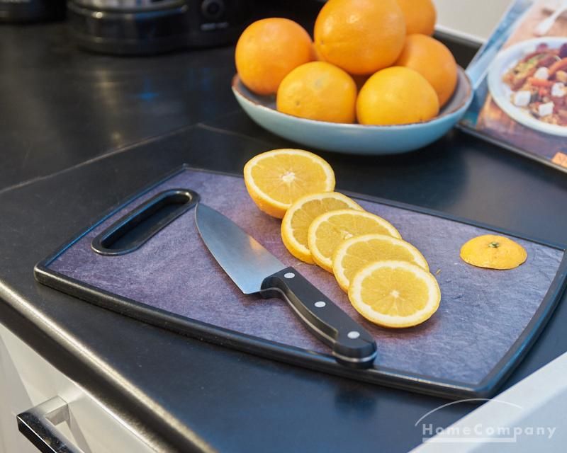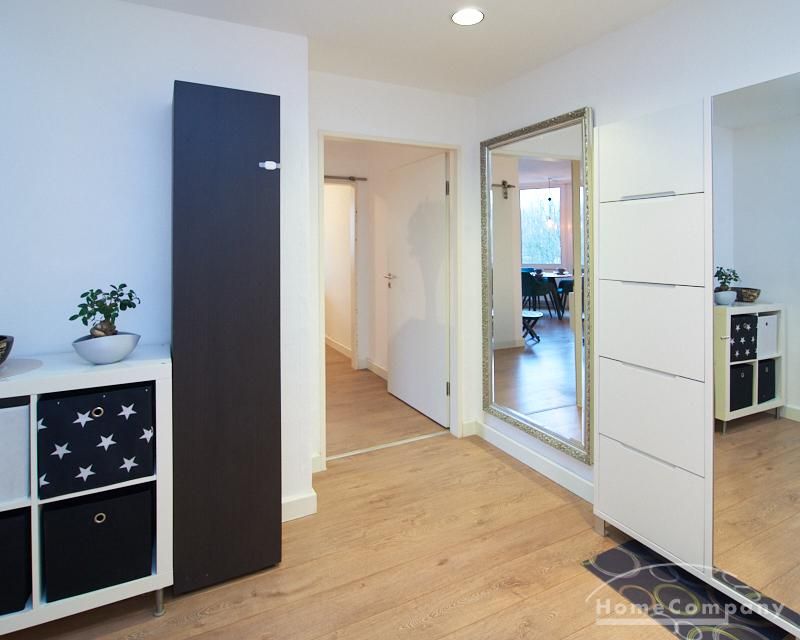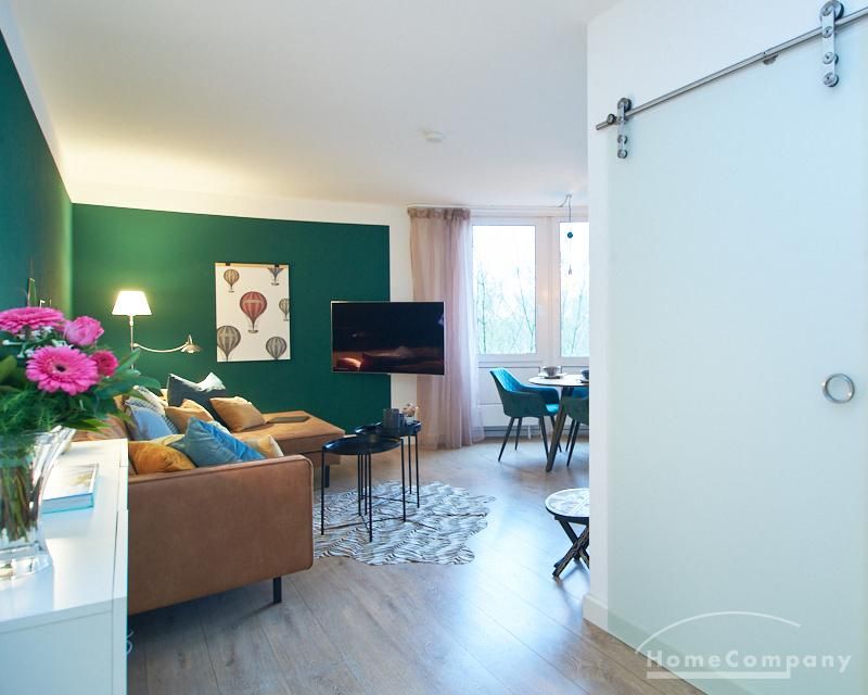 Modern and high-quality furnished apartment in a very central location. The apartment is open plan and has a friendly bedroom with a double bed. The living room is equipped with a comfortable seating area, dining area and a smart TV with installed entertainment package (Waipu, more than 290 TV channels) and is connected to the kitchen via a sliding door. Coin-operated washing machines and dryers are available in the house.