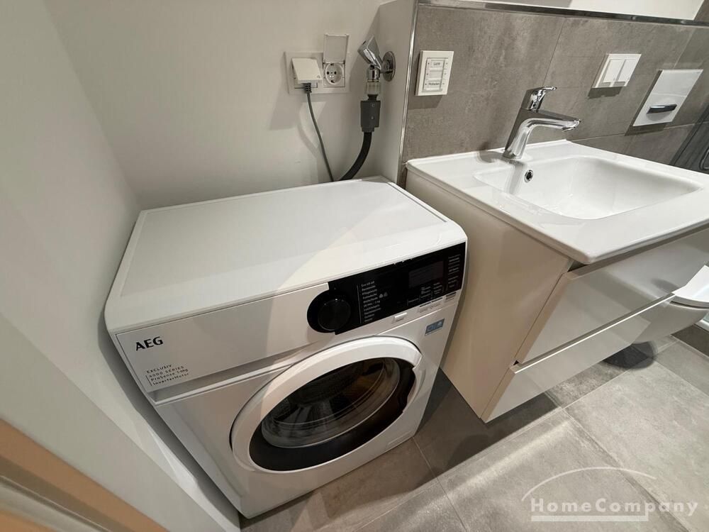 Modern shower bathroom with exclusive bathroom furniture, glass shower, and washing machine.
