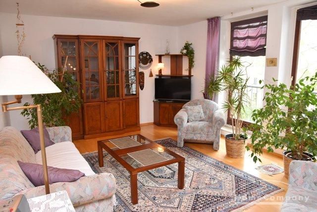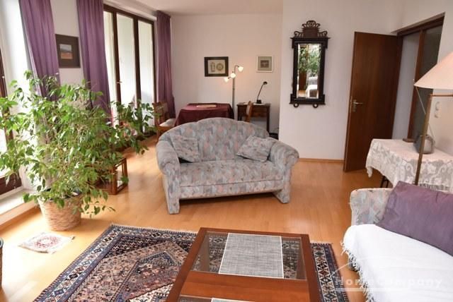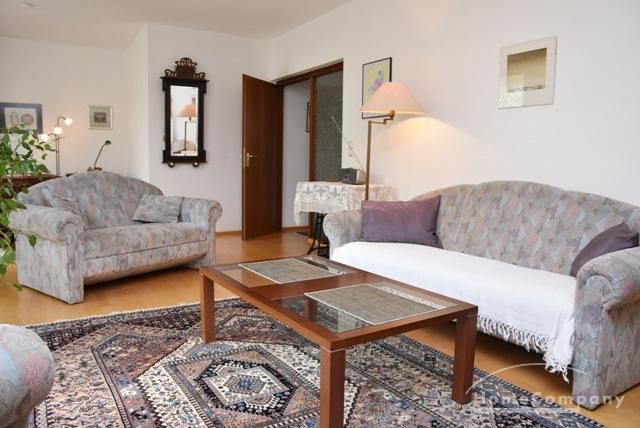 Sitting room approx. 30 sqm with 2 sofas 3+2 seater, armchair, glass table, glass cabinet cupboard, table with 2 chairs, flat cable TV, access to Loggia.