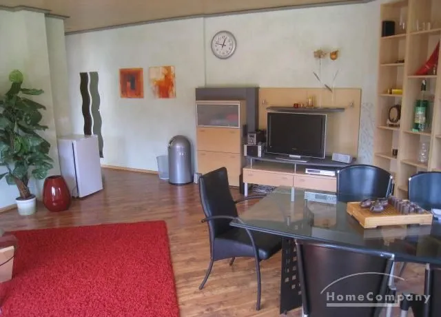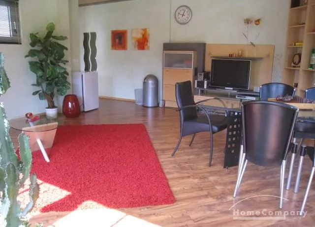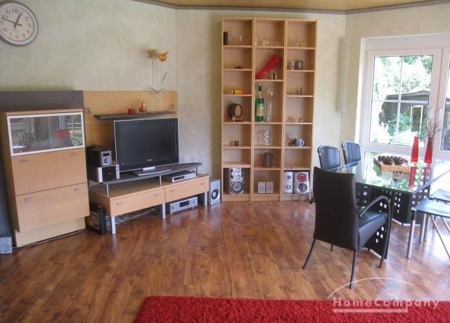 Live / cubicle with bed 140×200 cm (not yet on the photo), table with 4 chairs, shelve, wardrobe (not yet on photo), Shelve with SAT TV, access to the garden about tilled balcony with stair.