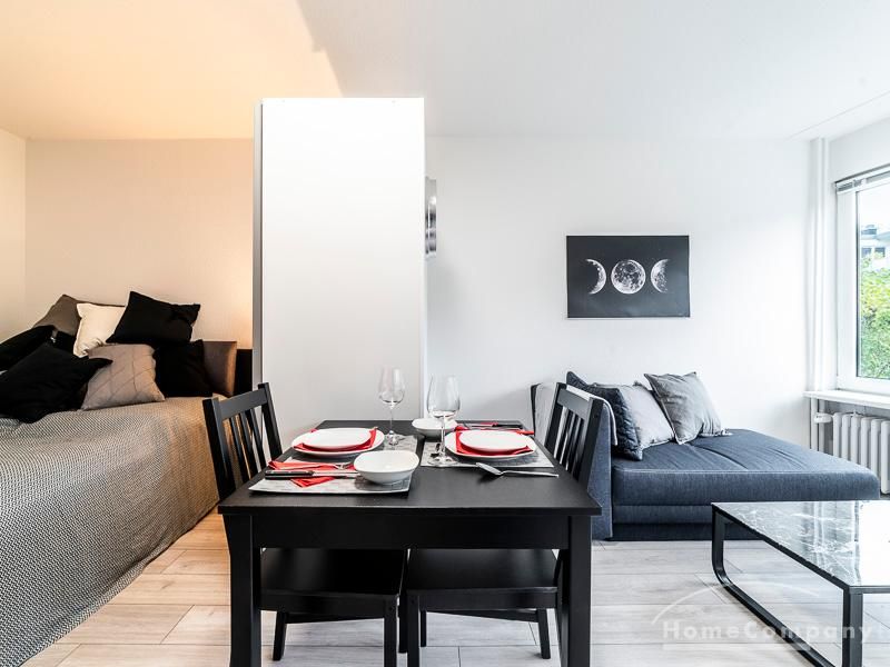 Very clearly divided into a living and a sleeping area, furnished apartment in a particularly quiet location.The city center can be reached by public transport in 33 minutes, all shops and restaurants are in Tibargcenter in about 650 meters within walking distance. In the sleeping area, a 1.60 m wide box spring bed provides restful comfort. In the living area is a cozy chaise longue, a sideboard and a dining table in concrete look with two chairs available.