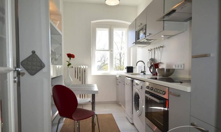 Nice and very quiet neighbourhood, the Friedenau urban rail station (S-Bahn S1) is within walking distance. Shops and restaurants are nearby. Easily commutable by car as the Statautobahn highway is only a few hundred yards away.