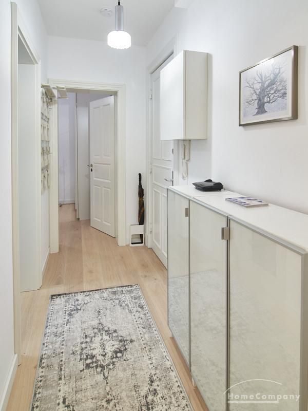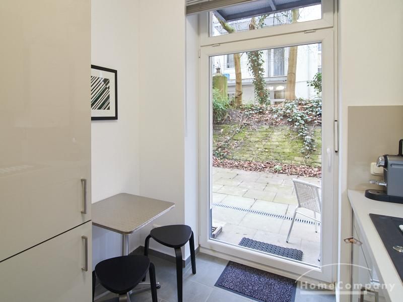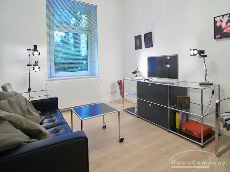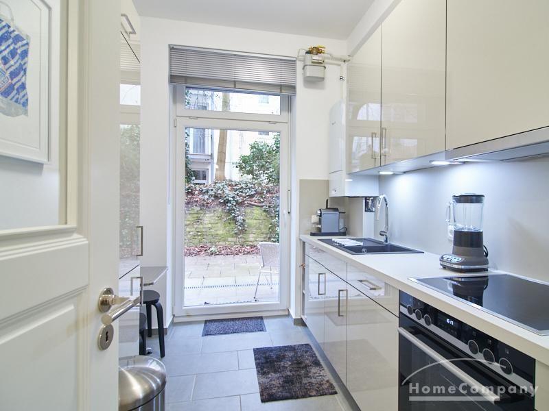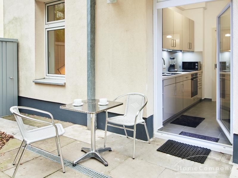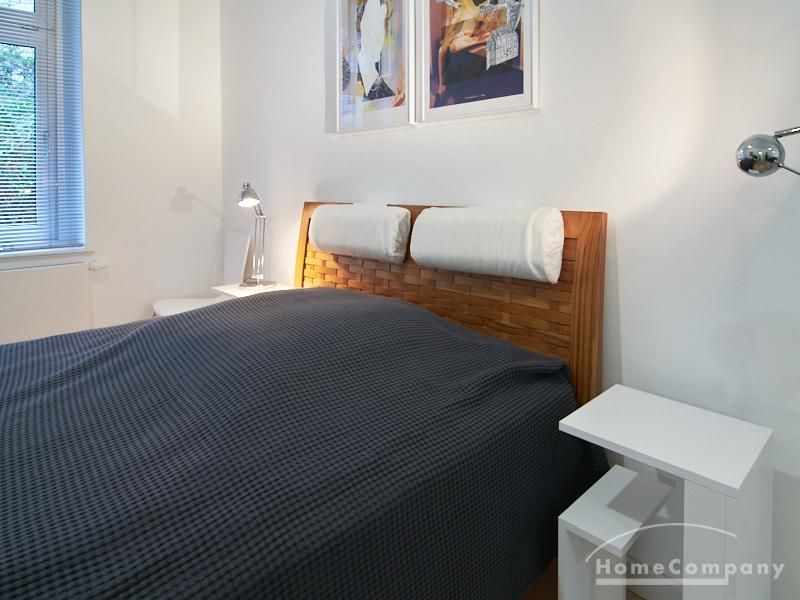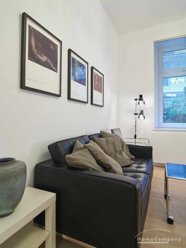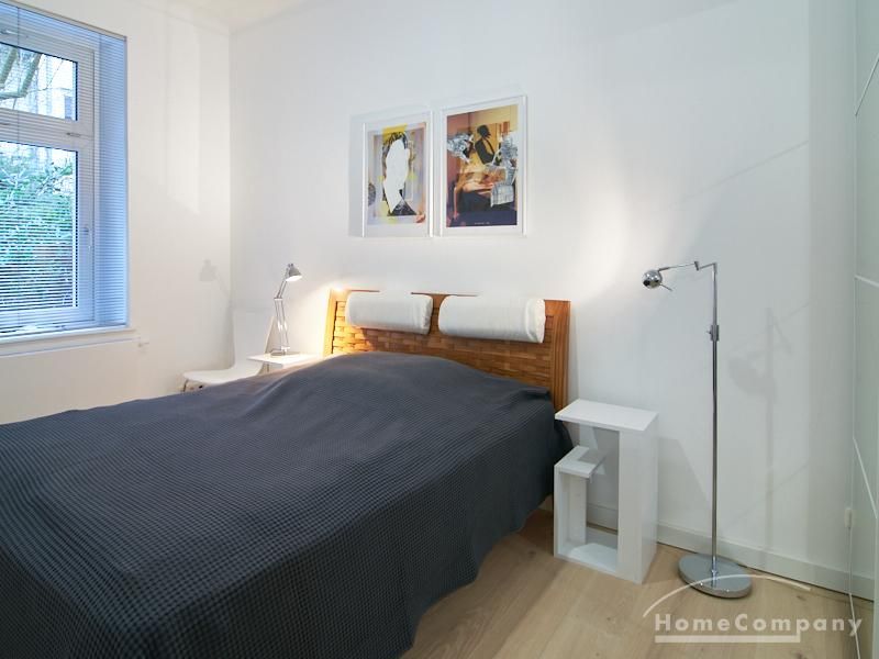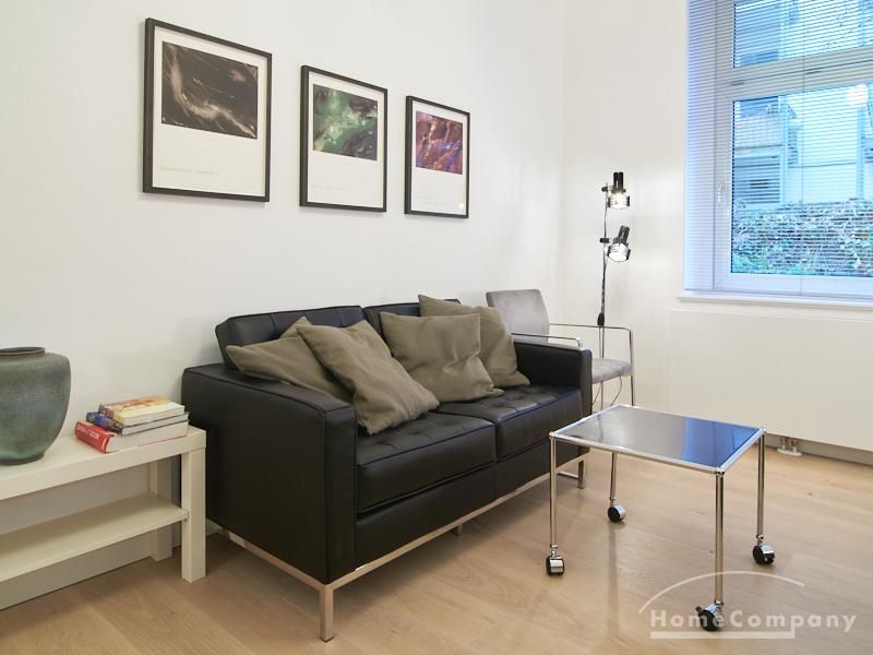 Furnished flat in a quiet residential street with typical Hamburg old buildings. The apartment facing the enclosed garden courtyard is very quiet. It is clear and modern in subtle colors. Beautiful oak parquet floors in combination with white coffered doors underline the pleasant ambience of the listed building. Stylish, partly large-scale, modern works of art set accents. The bedroom is furnished with a 1.20 wide bed. Here is a small work area with a table for the notebook. 100 Mbit Internet is set up. The apartment is equipped with a smart TV. The apartment offers plenty of closet space. The modern fitted kitchen is equipped with a dishwasher and washer dryer. The shower room has a modern design with anthracite-colored tiles and a floor-level shower. A special highlight is the large terrace. Garden furniture is available here in a storage box. A small area is protected from rain by the balcony above.