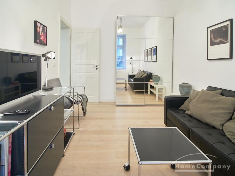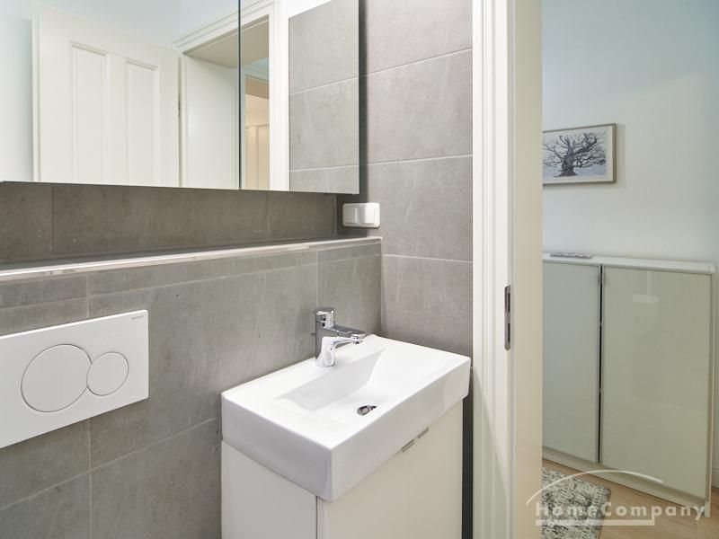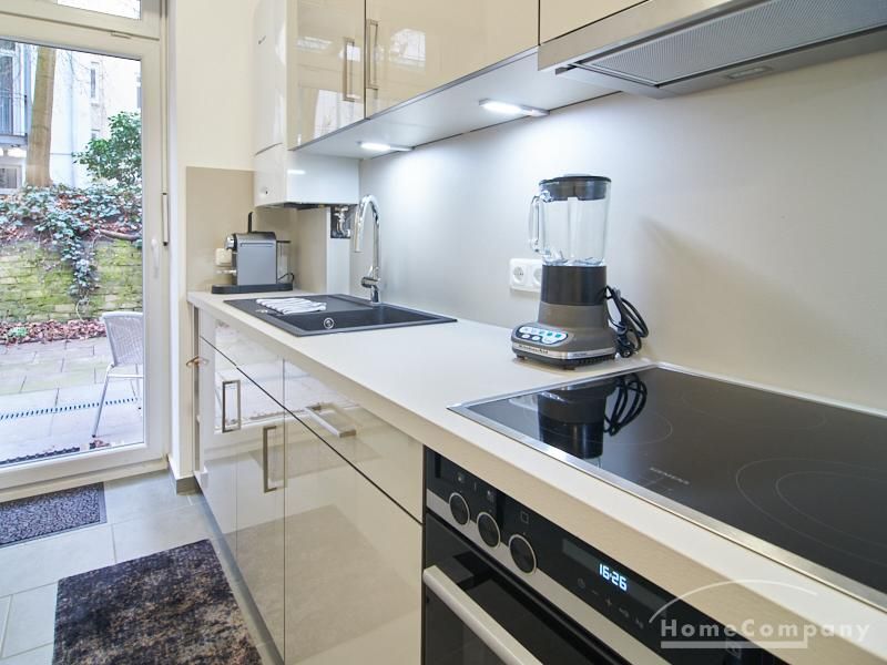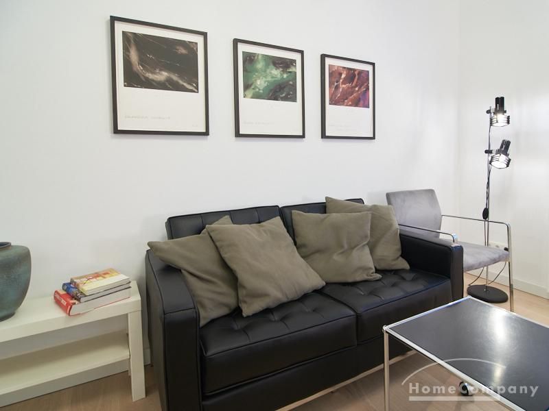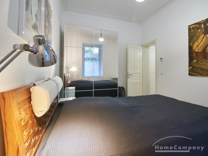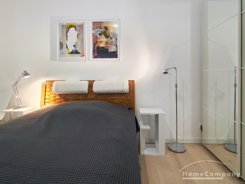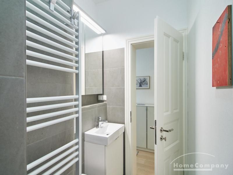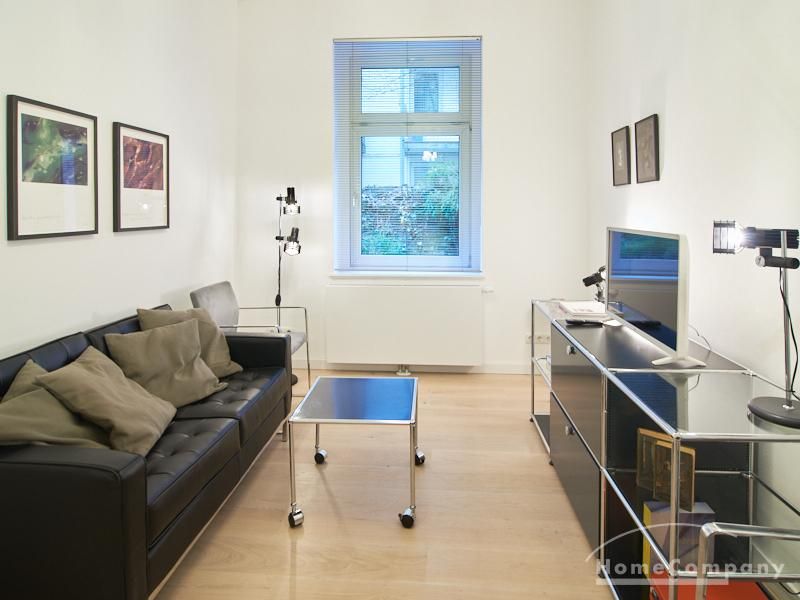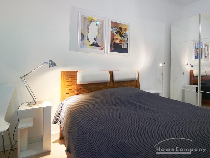 Furnished flat in a quiet residential street with typical Hamburg old buildings. The apartment facing the enclosed garden courtyard is very quiet. It is clear and modern in subtle colors. Beautiful oak parquet floors in combination with white coffered doors underline the pleasant ambience of the listed building. Stylish, partly large-scale, modern works of art set accents. The bedroom is furnished with a 1.20 wide bed. Here is a small work area with a table for the notebook. 100 Mbit Internet is set up. The apartment is equipped with a smart TV. The apartment offers plenty of closet space. The modern fitted kitchen is equipped with a dishwasher and washer dryer. The shower room has a modern design with anthracite-colored tiles and a floor-level shower. A special highlight is the large terrace. Garden furniture is available here in a storage box. A small area is protected from rain by the balcony above.