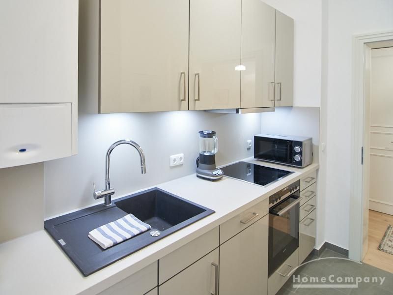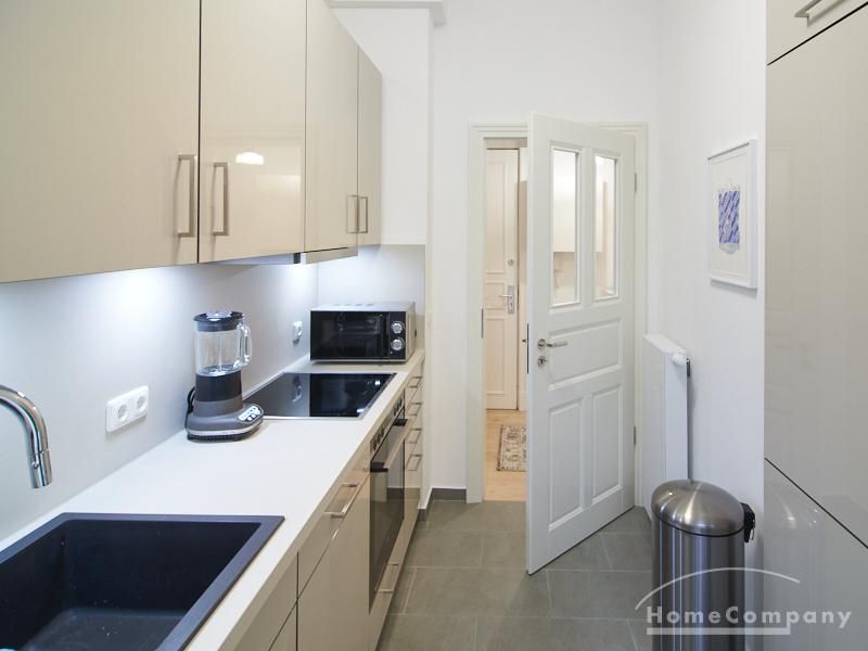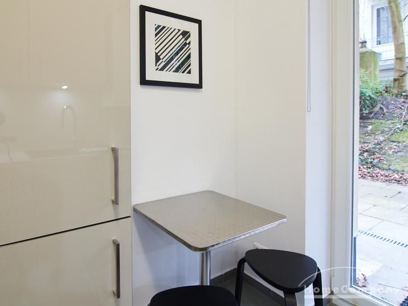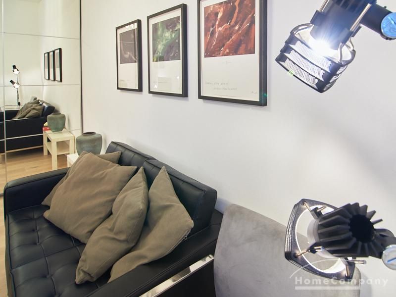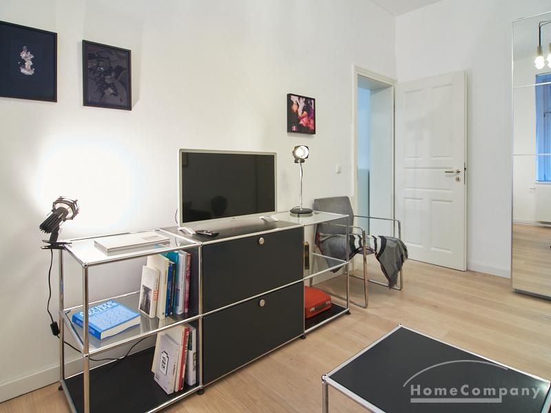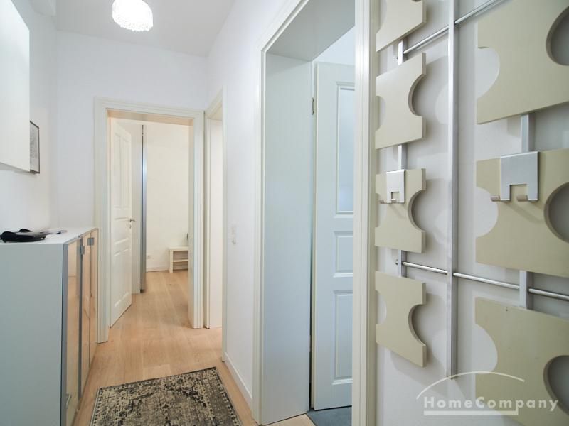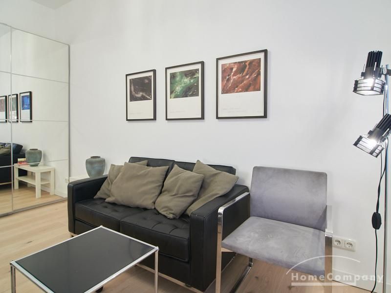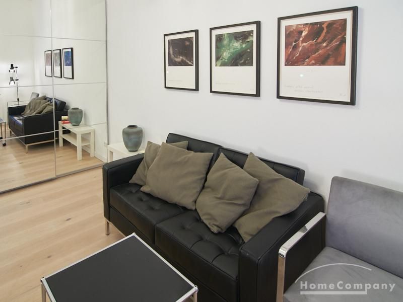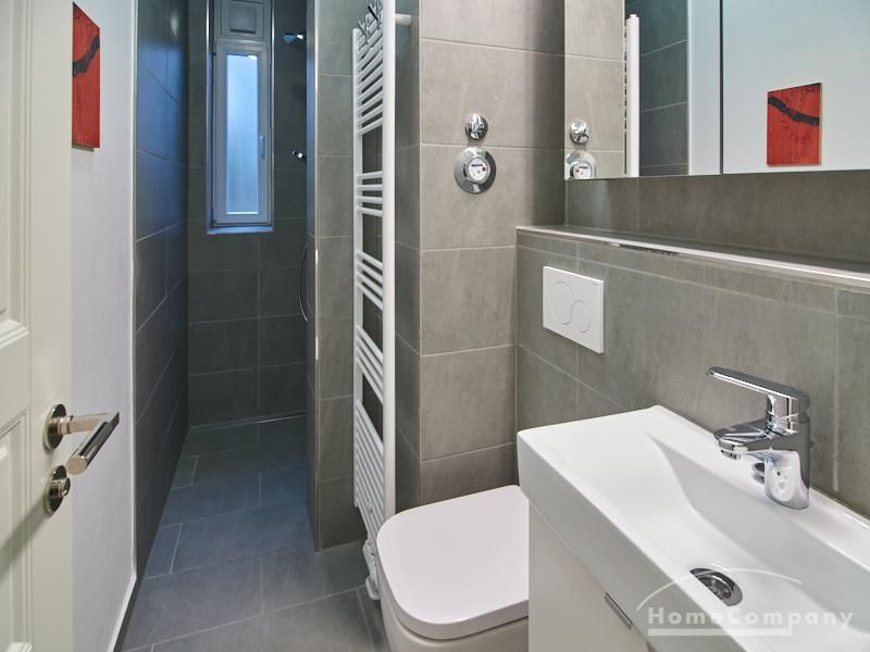 Furnished flat in a quiet residential street with typical Hamburg old buildings. The apartment facing the enclosed garden courtyard is very quiet. It is clear and modern in subtle colors. Beautiful oak parquet floors in combination with white coffered doors underline the pleasant ambience of the listed building. Stylish, partly large-scale, modern works of art set accents. The bedroom is furnished with a 1.20 wide bed. Here is a small work area with a table for the notebook. 100 Mbit Internet is set up. The apartment is equipped with a smart TV. The apartment offers plenty of closet space. The modern fitted kitchen is equipped with a dishwasher and washer dryer. The shower room has a modern design with anthracite-colored tiles and a floor-level shower. A special highlight is the large terrace. Garden furniture is available here in a storage box. A small area is protected from rain by the balcony above.