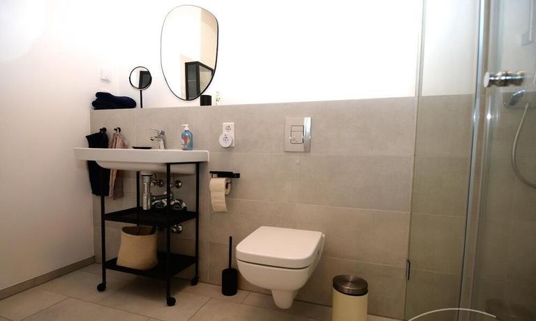 The bedroom integrates seamlessly into the well-designed layout. A modern bathroom with a large walk-in shower, along with a practical utility room equipped with a washer-dryer, completes the overall comfort.