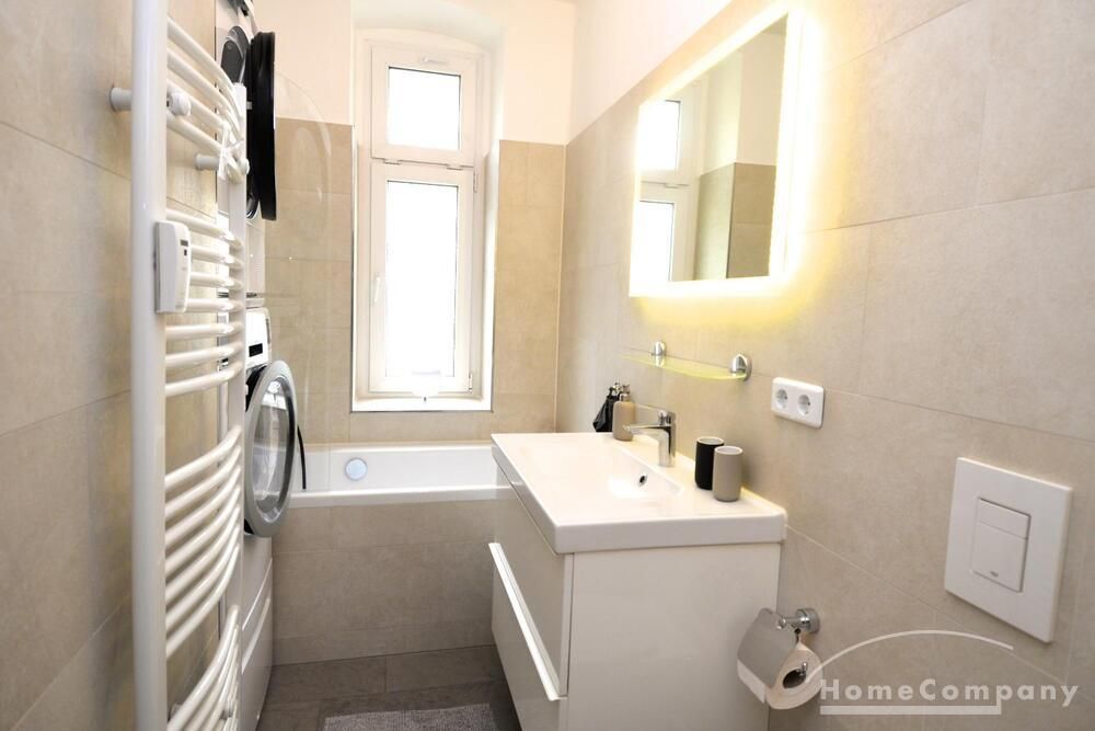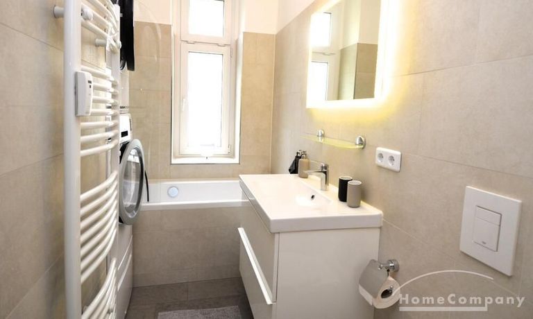 A duo bathtub with a foldable glass shower wall, a vanity unit with a sink and a wall cupboard have also been newly installed.