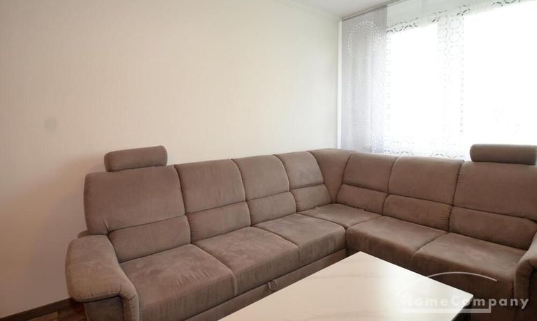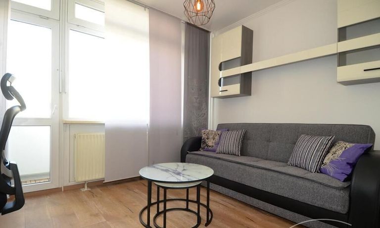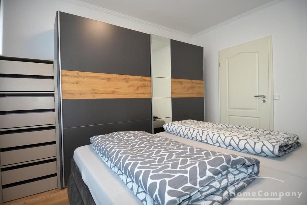 The apartment has a bedroom with a double bed and another guest room with a desk. The balcony is accessible from the guest room. The modern kitchen is open to the living room. There is a lounge area and a dining table with 5 chairs.