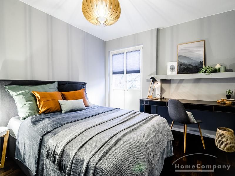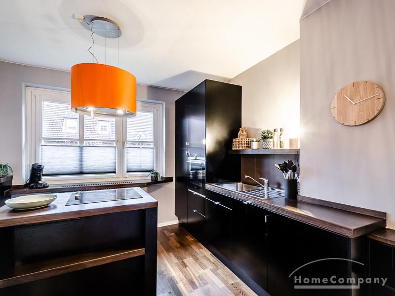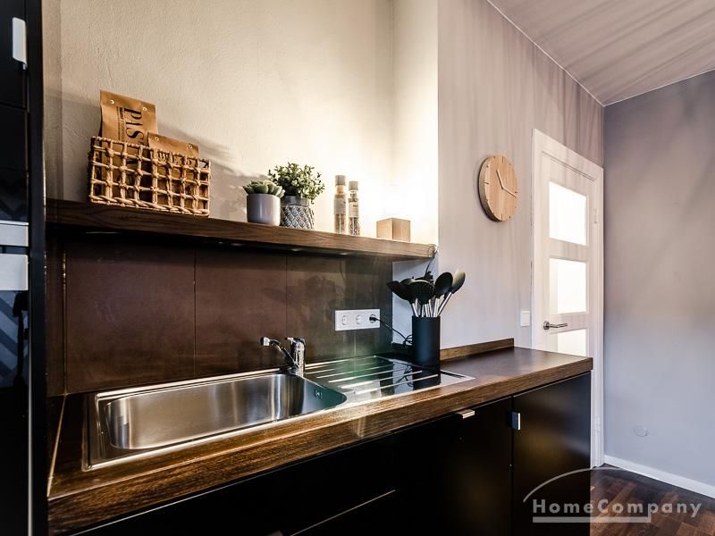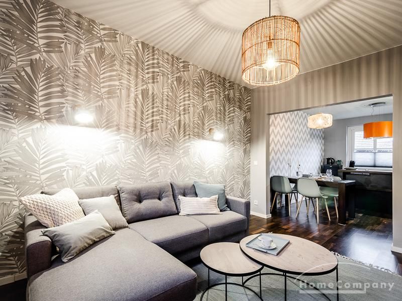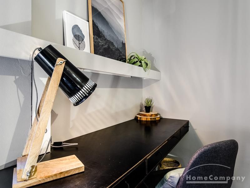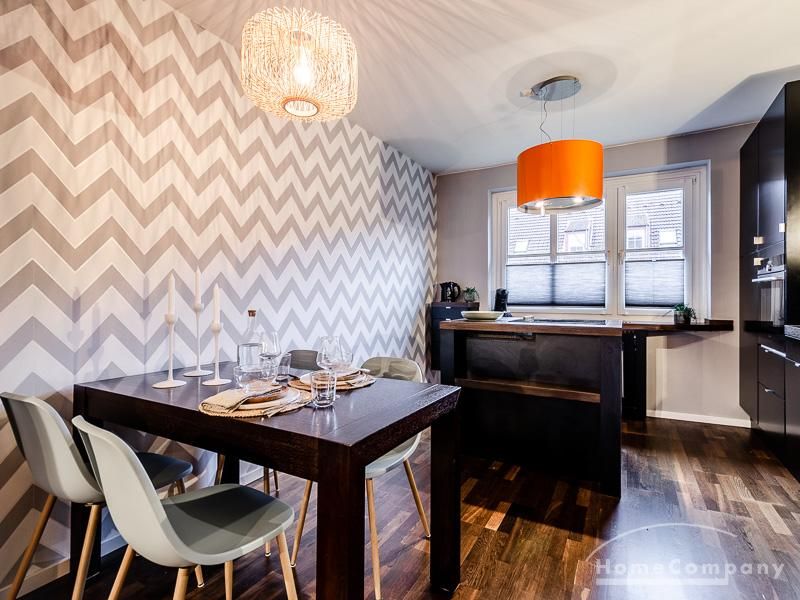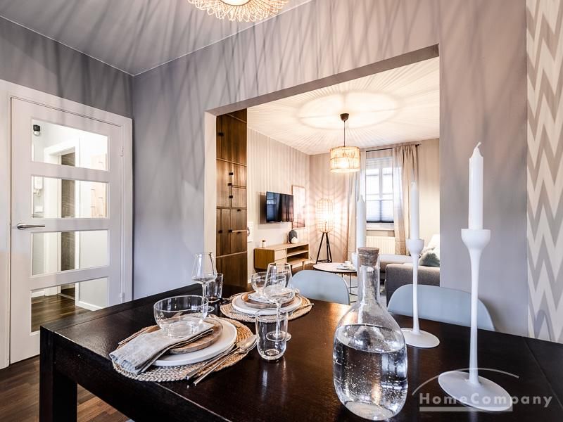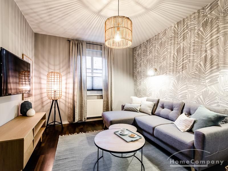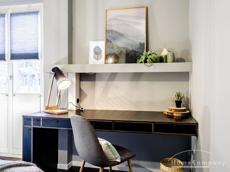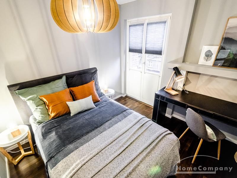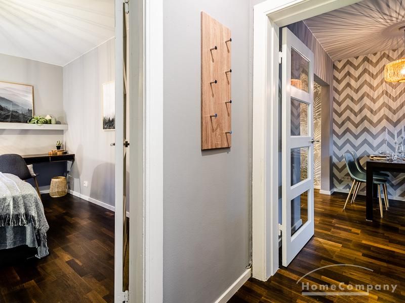 This complete furnished apartment is a high quality oasis of peace in the popular district Ottensen. The nature @ work style combines an urban, modern lifestyle with a contemporary stylish business look, comfort, originality and an urban, multi-faceted furnishing style. The large kitchen is kept open to the living room. The bright daylight bathroom has been equipped with a new shower and a washing machine. The 1.40 m box spring bed guarantees high sleeping comfort. From the bedroom you can reach the small balcony and the large, walk-in wardrobe. The built-in wardrobes in the hallway further storage options.