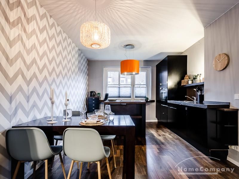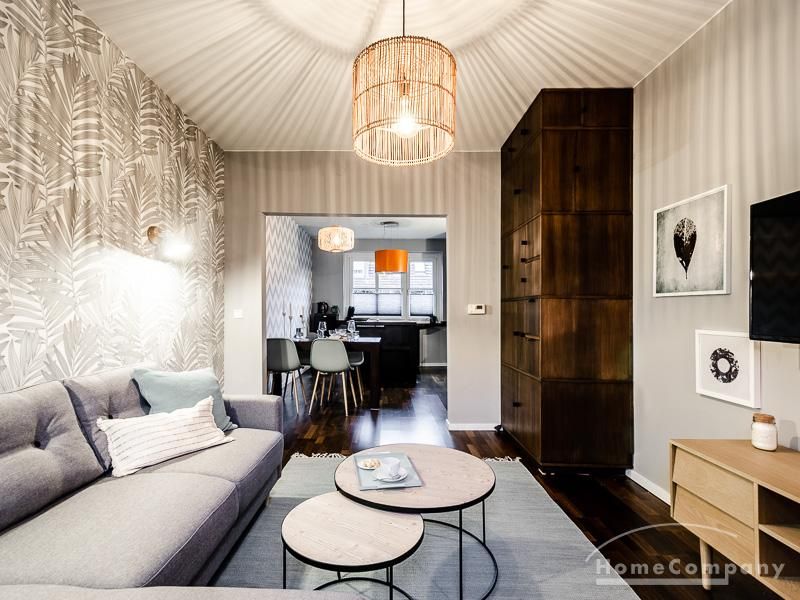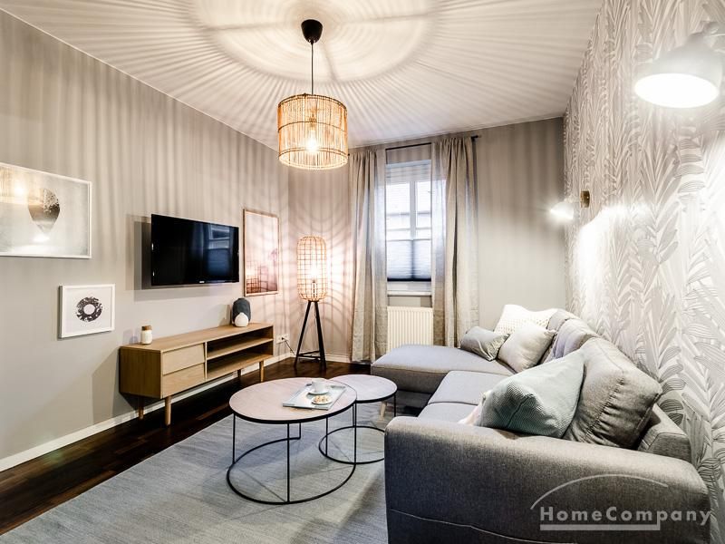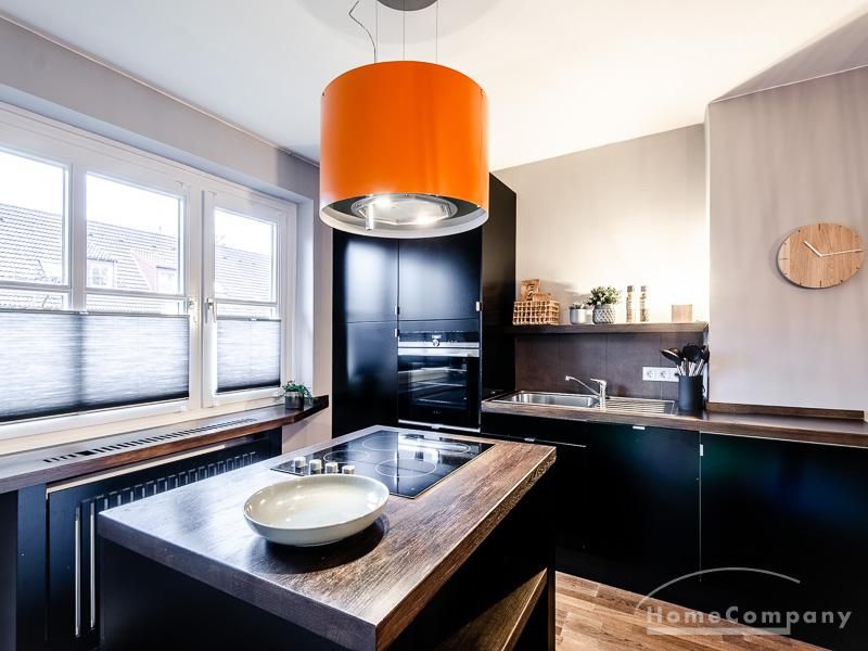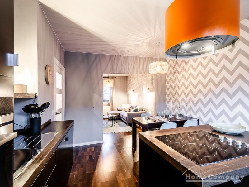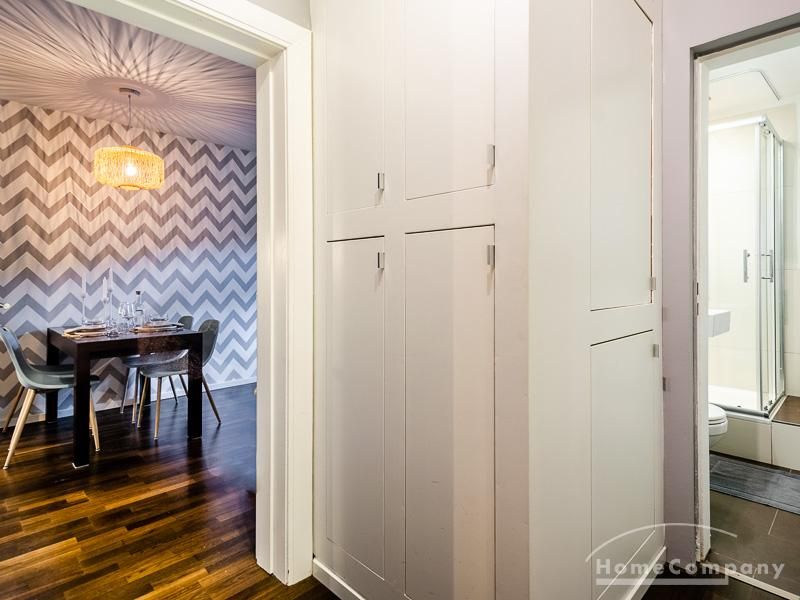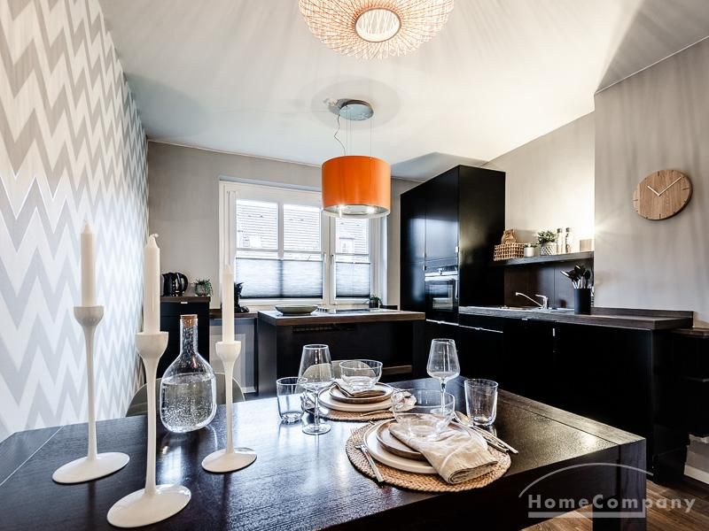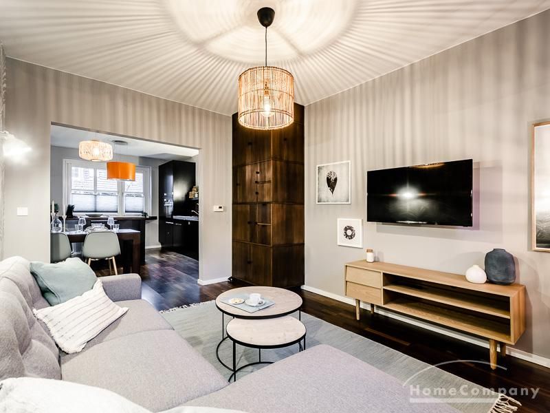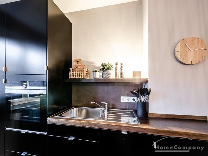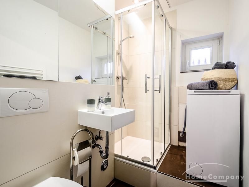 This complete furnished apartment is a high quality oasis of peace in the popular district Ottensen. The nature @ work style combines an urban, modern lifestyle with a contemporary stylish business look, comfort, originality and an urban, multi-faceted furnishing style. The large kitchen is kept open to the living room. The bright daylight bathroom has been equipped with a new shower and a washing machine. The 1.40 m box spring bed guarantees high sleeping comfort. From the bedroom you can reach the small balcony and the large, walk-in wardrobe. The built-in wardrobes in the hallway further storage options.